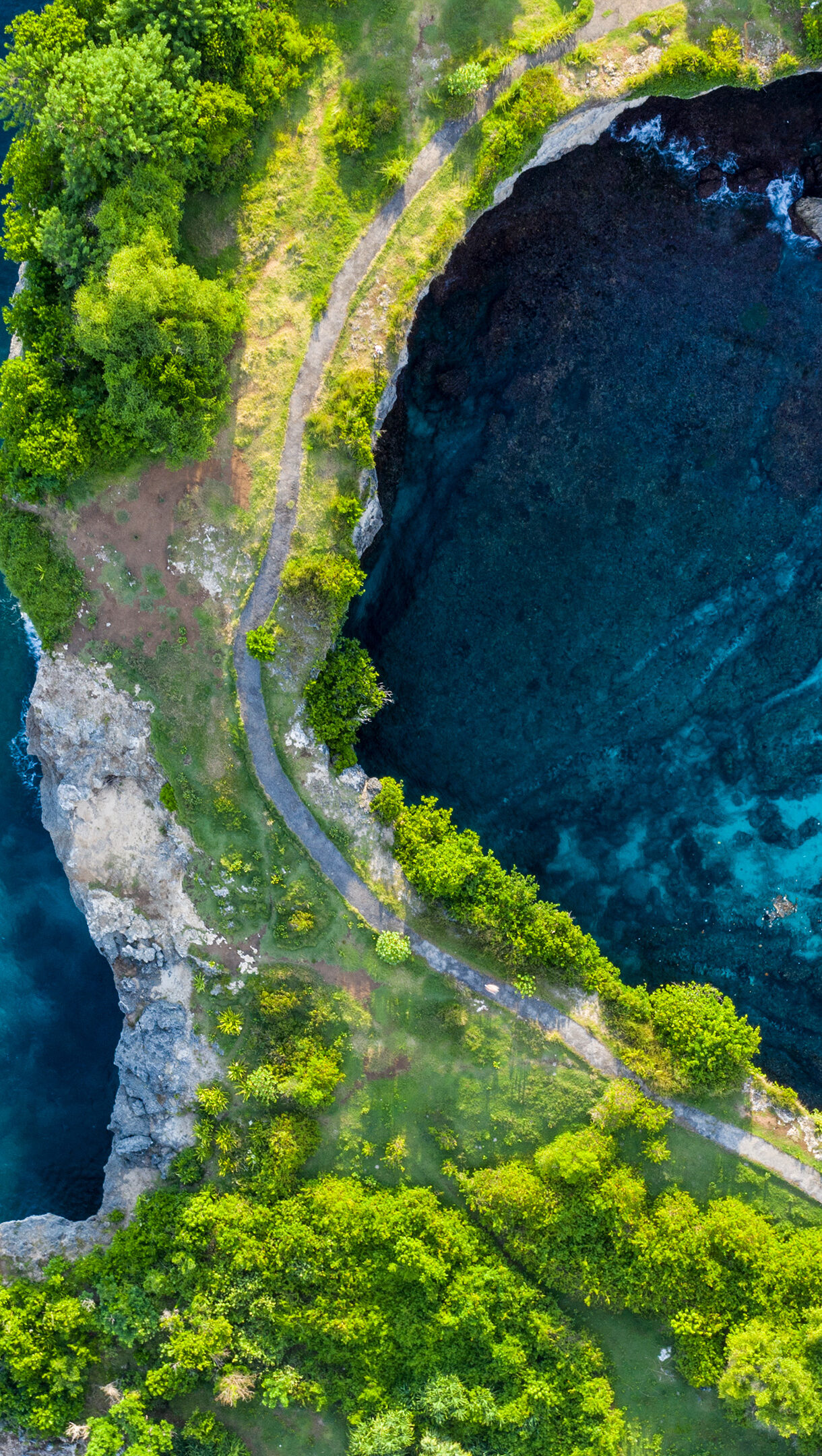 A captivating 4K wallpaper offering an aerial view of the iconic Broken Beach on Nusa Penida, Bali, Indonesia, where a pristine turquoise lagoon is encircled by verdant cliffs. The stark contrast between the vibrant green foliage, the deep blue open ocean, and the clear shallow waters within the natural circular cove creates an inviting, serene tropical escape.