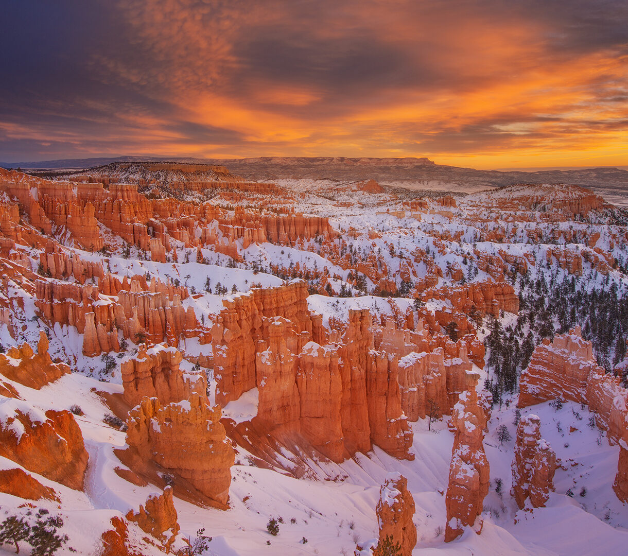 A breathtaking 4K wallpaper capturing the iconic Bryce Canyon hoodoos covered in a blanket of winter snow across the vast Utah landscape. The dramatic winter sunset paints the sky with vibrant oranges and deep purples, casting an ethereal glow that emphasizes the striking contrast between the red rock formations and the pristine white snow.