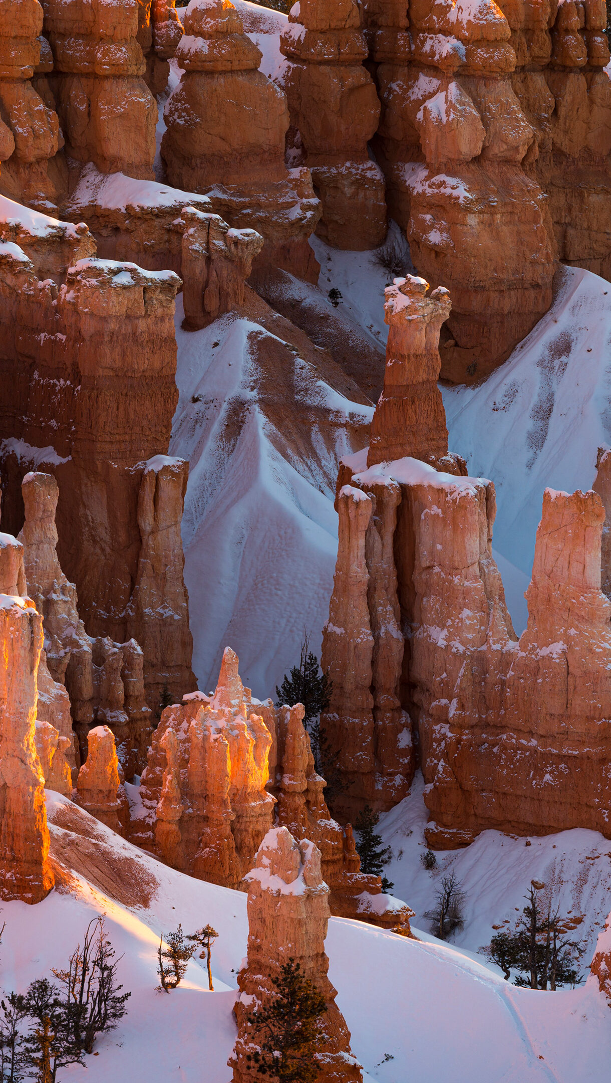 A majestic 4K wallpaper showcases the unique winter landscape of Bryce Canyon National Park, Utah, where countless snow-capped hoodoos rise from the dramatic basin. Golden light bathes the orange rock formations, sharply contrasting with the pristine white snow that blankets the ground and caps the intricate pinnacles, creating a serene and stunning scene.