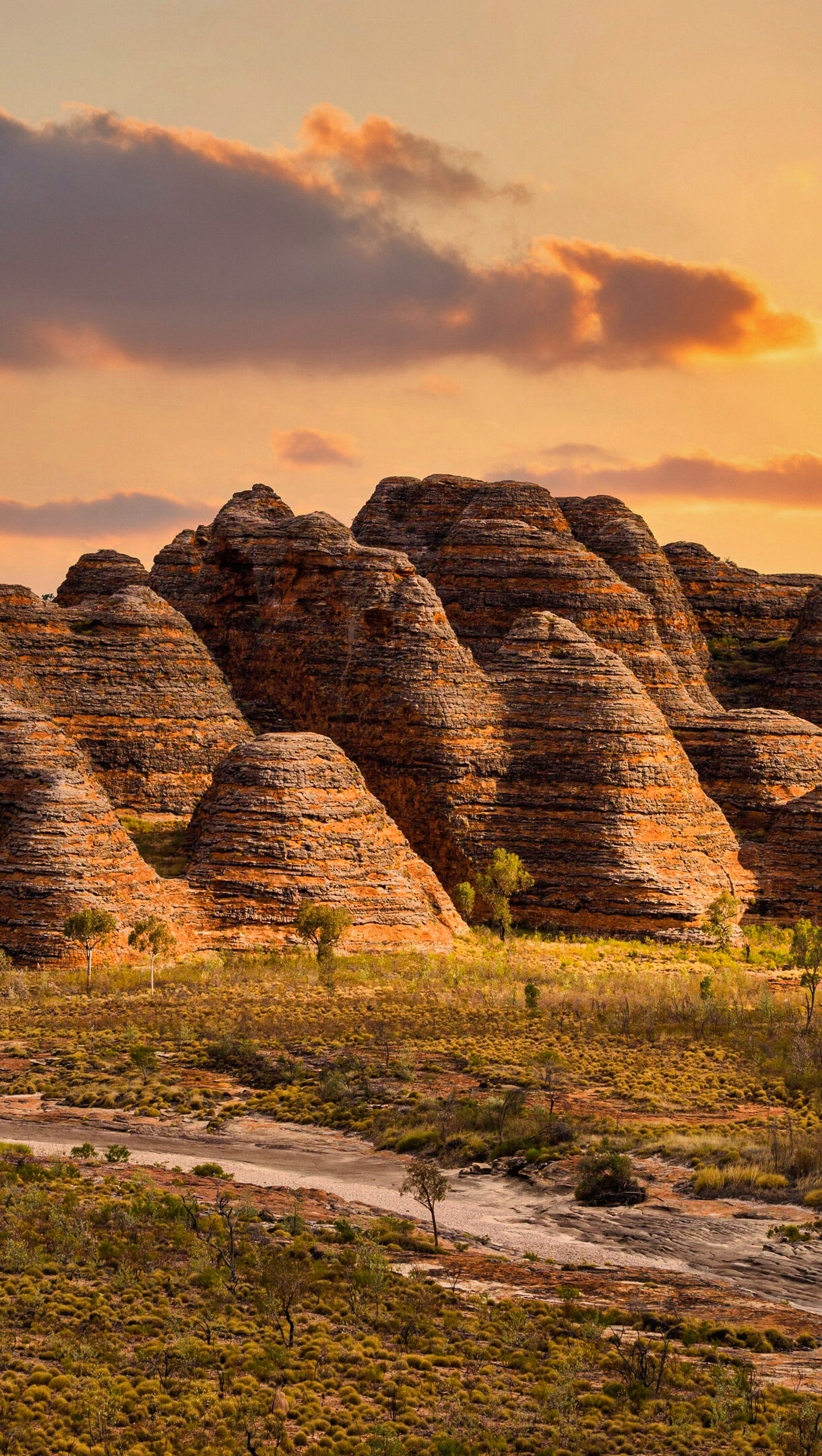 An awe-inspiring 4K wallpaper captures the Bungle Bungle Range within Purnululu National Park, showcasing its unique geological landscape. The dramatic sunset bathes the iconic banded sandstone domes in a rich golden and orange light, creating a majestic and vibrant scene across the vast terrain.