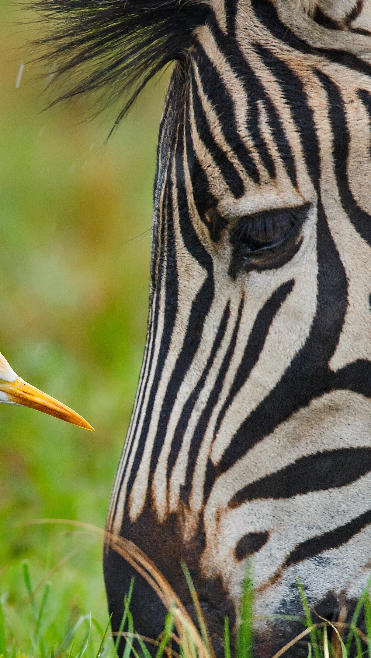 A captivating 4K wallpaper depicting a Burchell's Zebra's head and neck close to a Cattle Egret in a vibrant green field at Rietvlei Nature Reserve. Gentle rain streaks softly through the frame, creating a tranquil and intimate moment between the two animals.