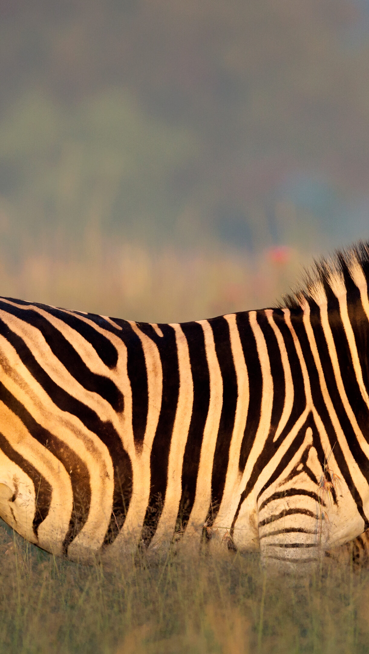 A captivating 4K wallpaper reveals a Burchell's zebra mother and her young foal standing in the golden light of an African grassland. The warm, diffused glow accentuates their vivid black and white stripes and highlights the tender bond between them against the soft, blurred background.