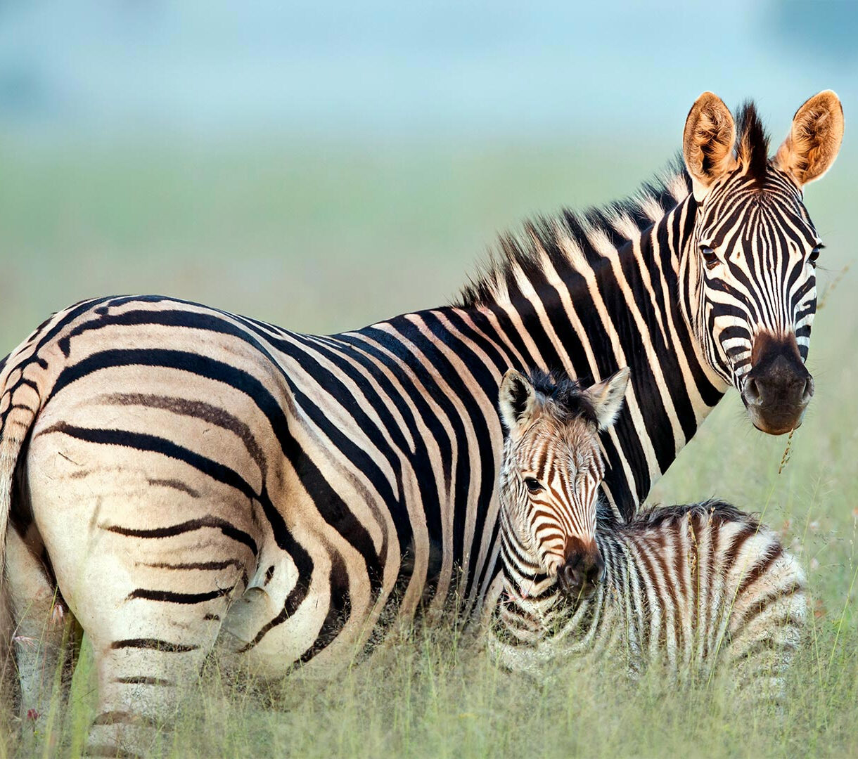 A captivating 4K wallpaper showcases a Burchell's Zebra mother and her foal standing serenely in the tall, soft green grasses of Rietvlei Nature Reserve. Their striking black and white stripes pop against the softly blurred, ethereal green and blue background, while the foal's direct gaze adds an intimate, endearing touch.