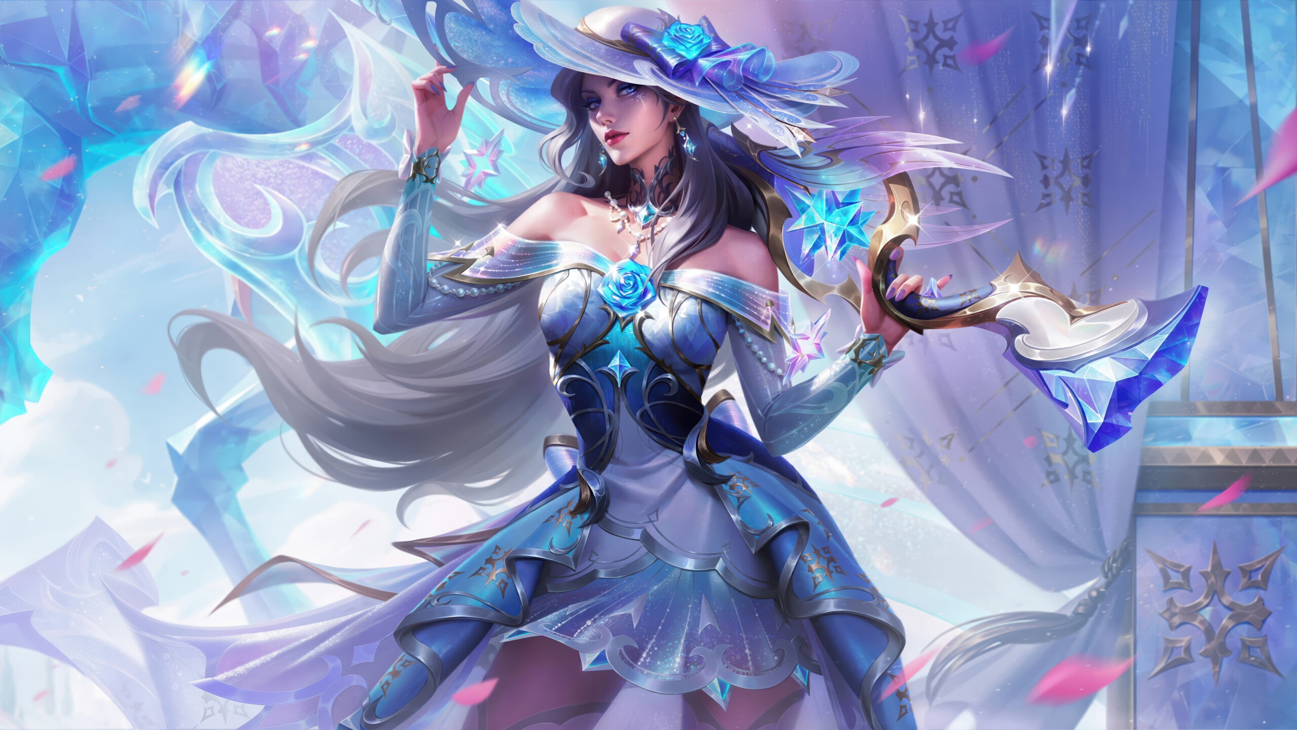 A resplendent 4K wallpaper featuring Caitlyn in her Crystal Rose Prestige Skin, depicted with elegant poise amidst a sparkling, ethereal crystalline environment. The interplay of brilliant sapphire and soft white hues with dazzling light refractions emphasizes the luxurious and magical essence of her design.
