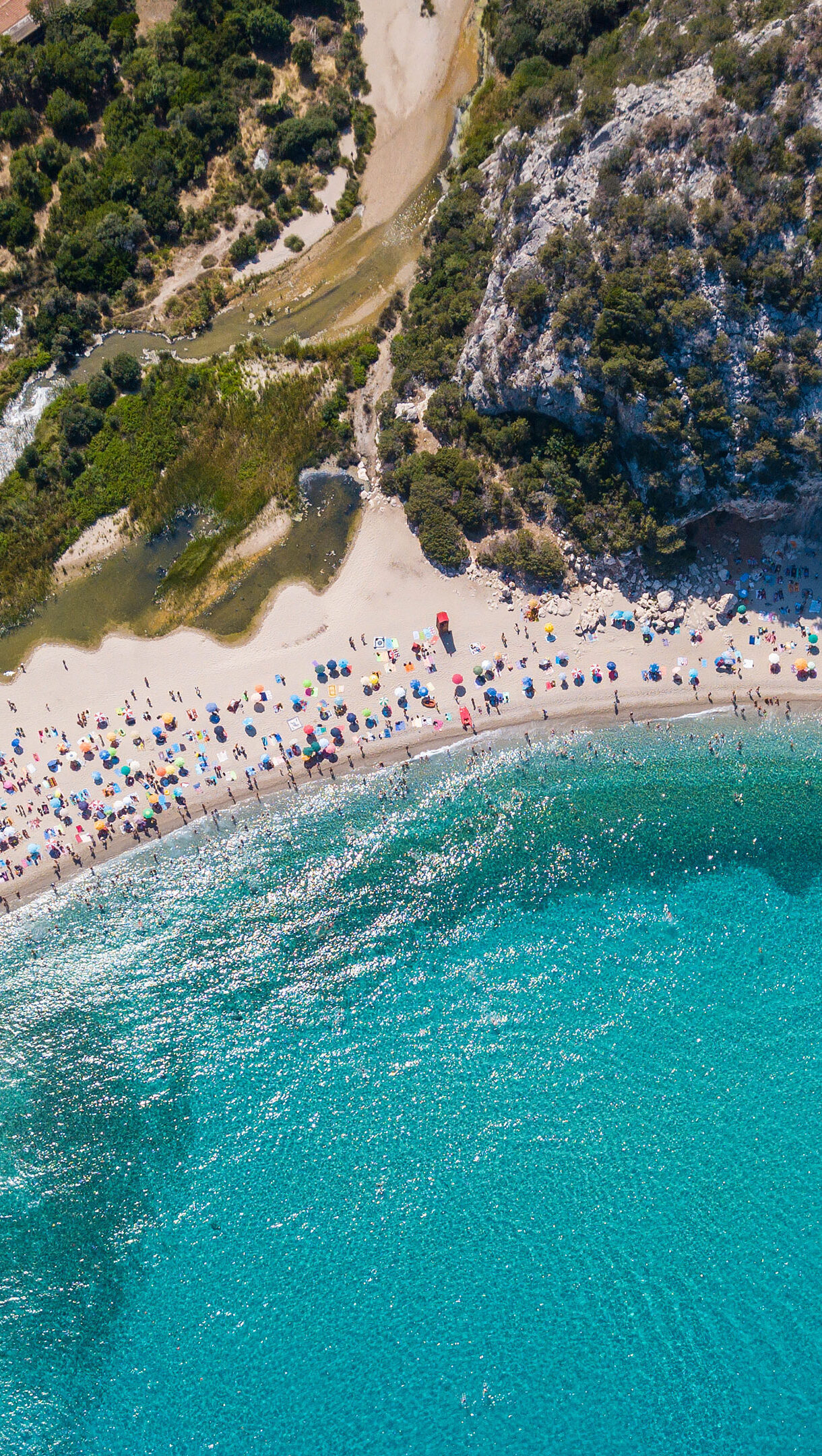 A stunning 4K wallpaper showcasing Cala Luna Beach, Sardinia's renowned turquoise paradise, with its crescent of golden sand bordered by lush green cliffs and a winding river. The spectacularly clear, brilliant turquoise waters are alive with sunlight, inviting numerous bathers into their sparkling depths.