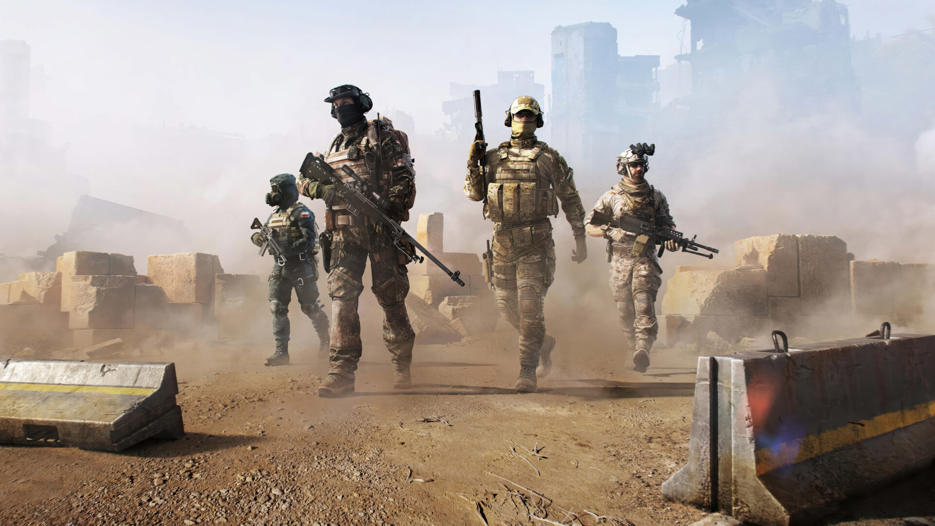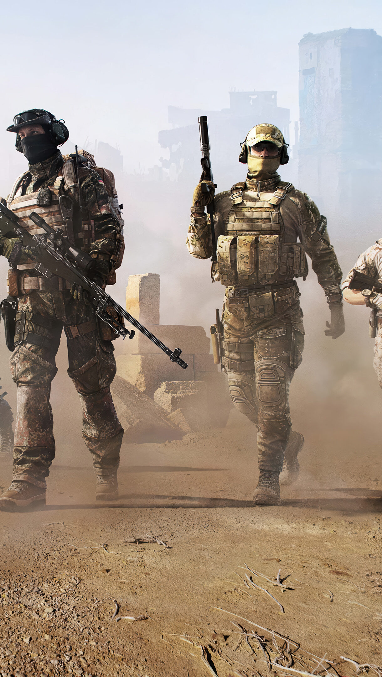 A formidable 4K wallpaper featuring four tactical game soldiers advancing through a dust-filled, ruined urban landscape. The diffuse light piercing through thick dust highlights their focused march, underscoring the desolation of their combat environment.