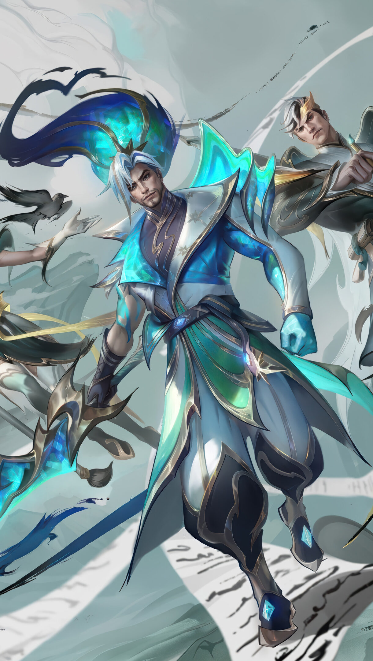 A striking 4K wallpaper portraying the Calligraphia skins of Yasuo, Jarvan IV, Janna, Tryndamere, and Xayah from LoL, dynamically posed within an ethereal, ink-wash painting landscape. The composition features sweeping brushstrokes and a muted palette, highlighted by vibrant teal and gold accents that define their powerful forms and mystical aura.