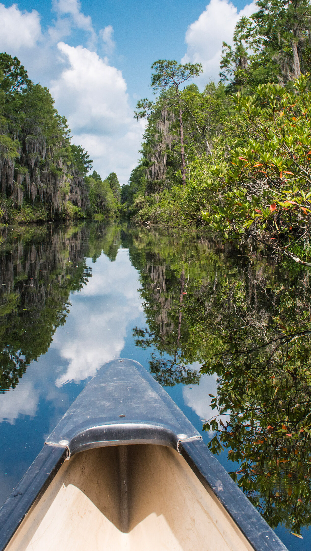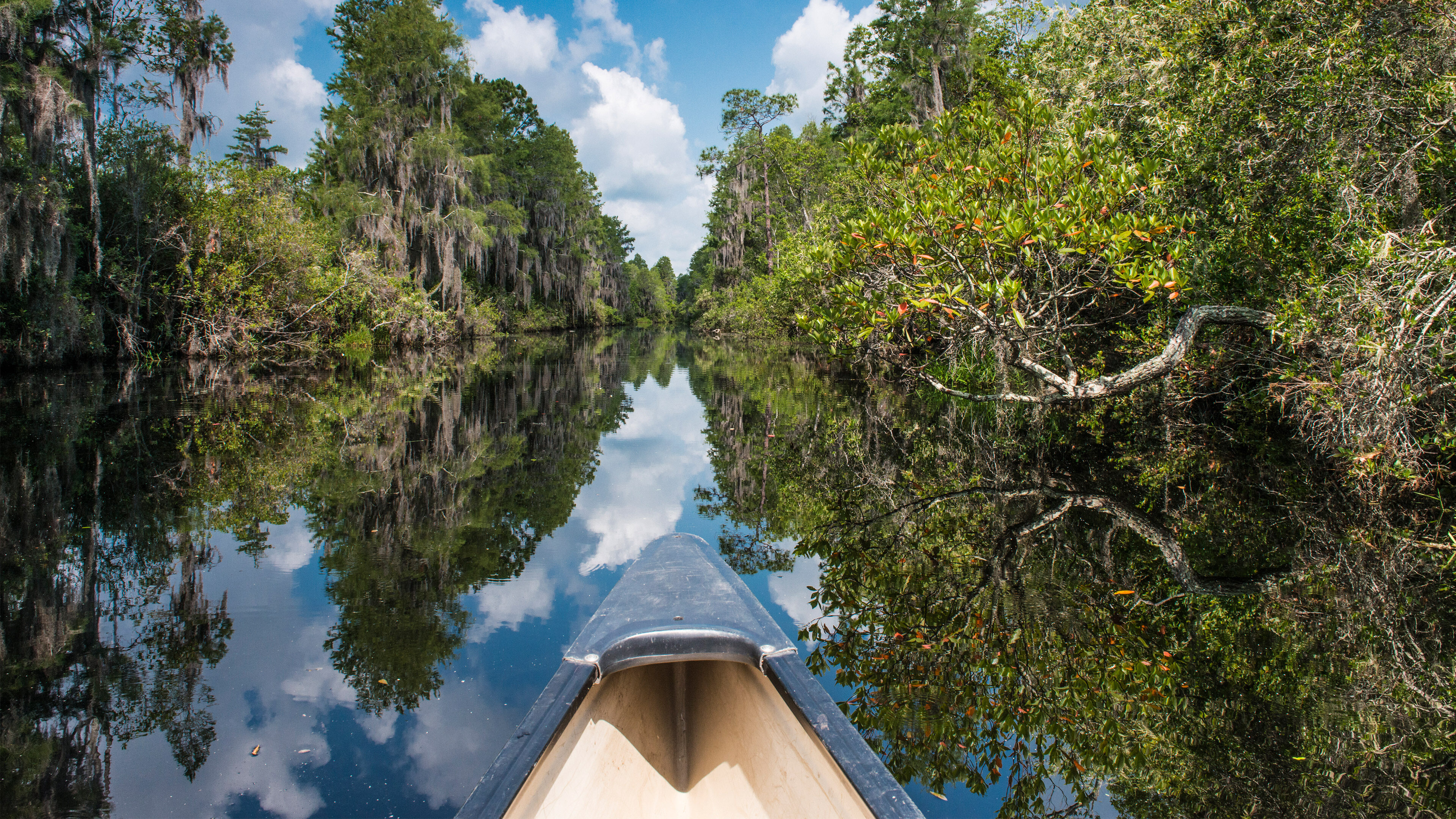 A tranquil 4K wallpaper captures the bow of a canoe gently traversing a narrow waterway within the Okefenokee National Wildlife Refuge in Georgia, flanked by cypress trees draped with Spanish moss. The calm, dark water perfectly reflects the vibrant blue sky with fluffy white clouds and the lush green banks, creating a stunning, almost dreamlike symmetry.