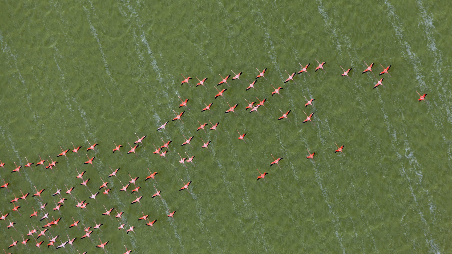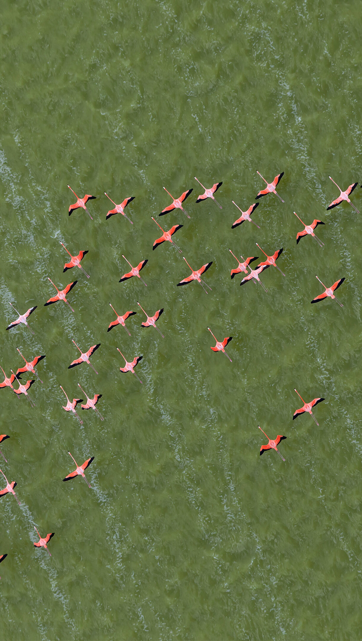 Caribbean Flamingos Flying Over Green Water Yucatan Peninsula Mexico