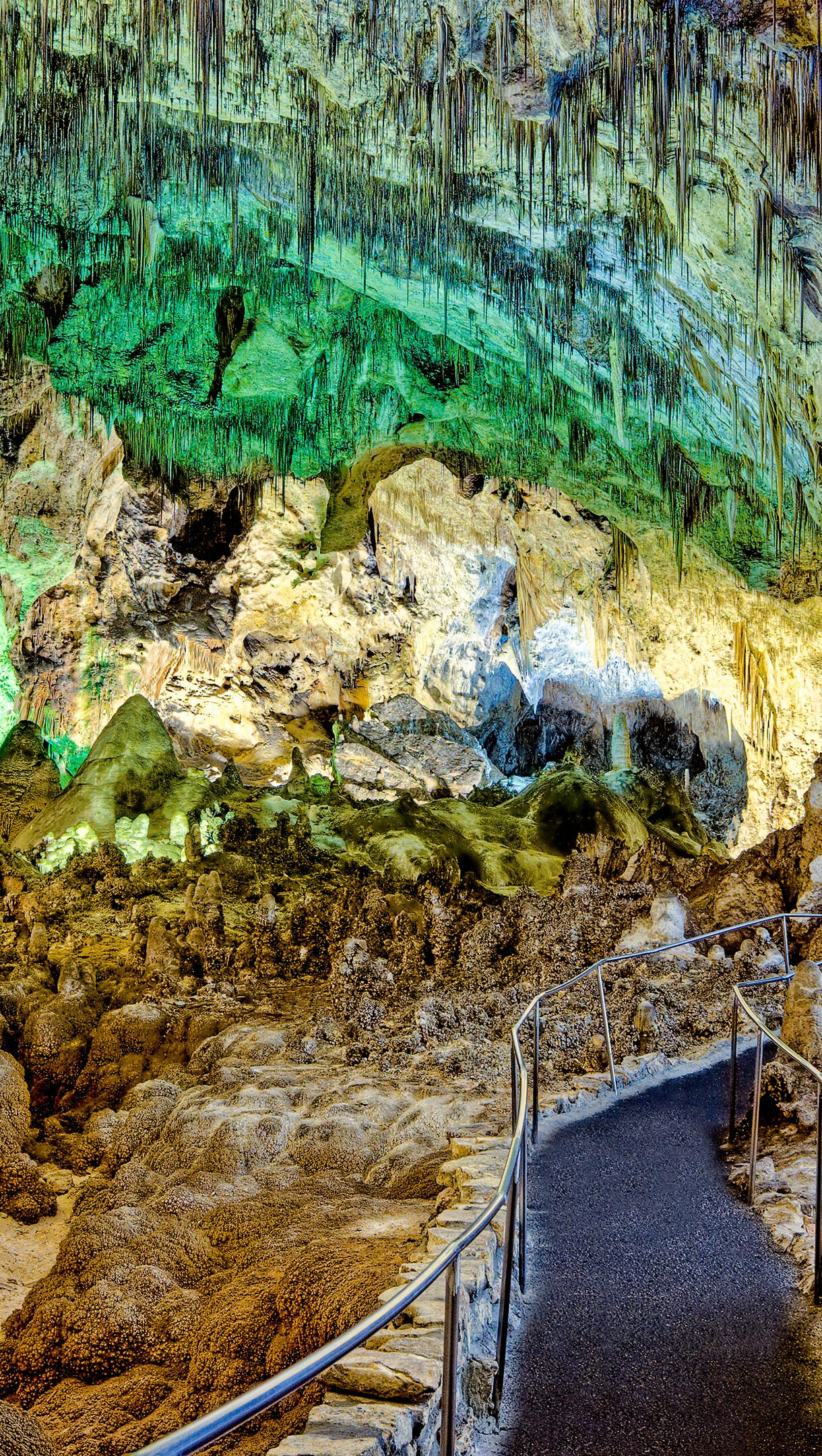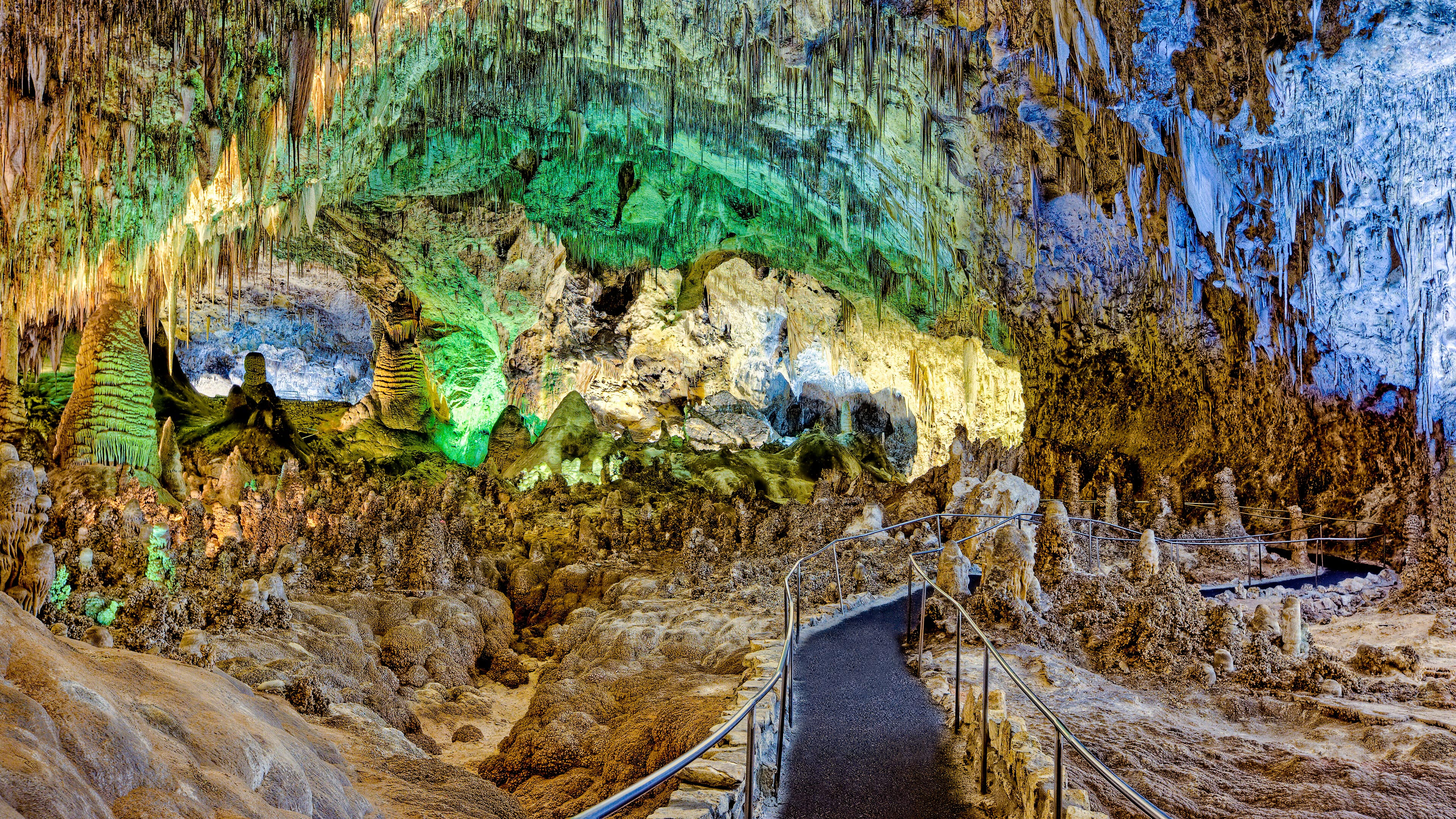 A breathtaking 4K wallpaper showcases the vast Big Room of Carlsbad Caverns, with an illuminated walkway winding through an immense chamber of geological formations. Vibrant spotlights cast ethereal greens, yellows, and blues across countless stalactites, stalagmites, and flowstones, creating an otherworldly and awe-inspiring subterranean landscape.