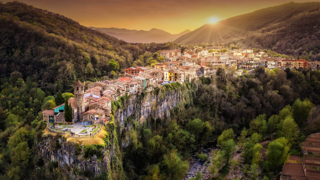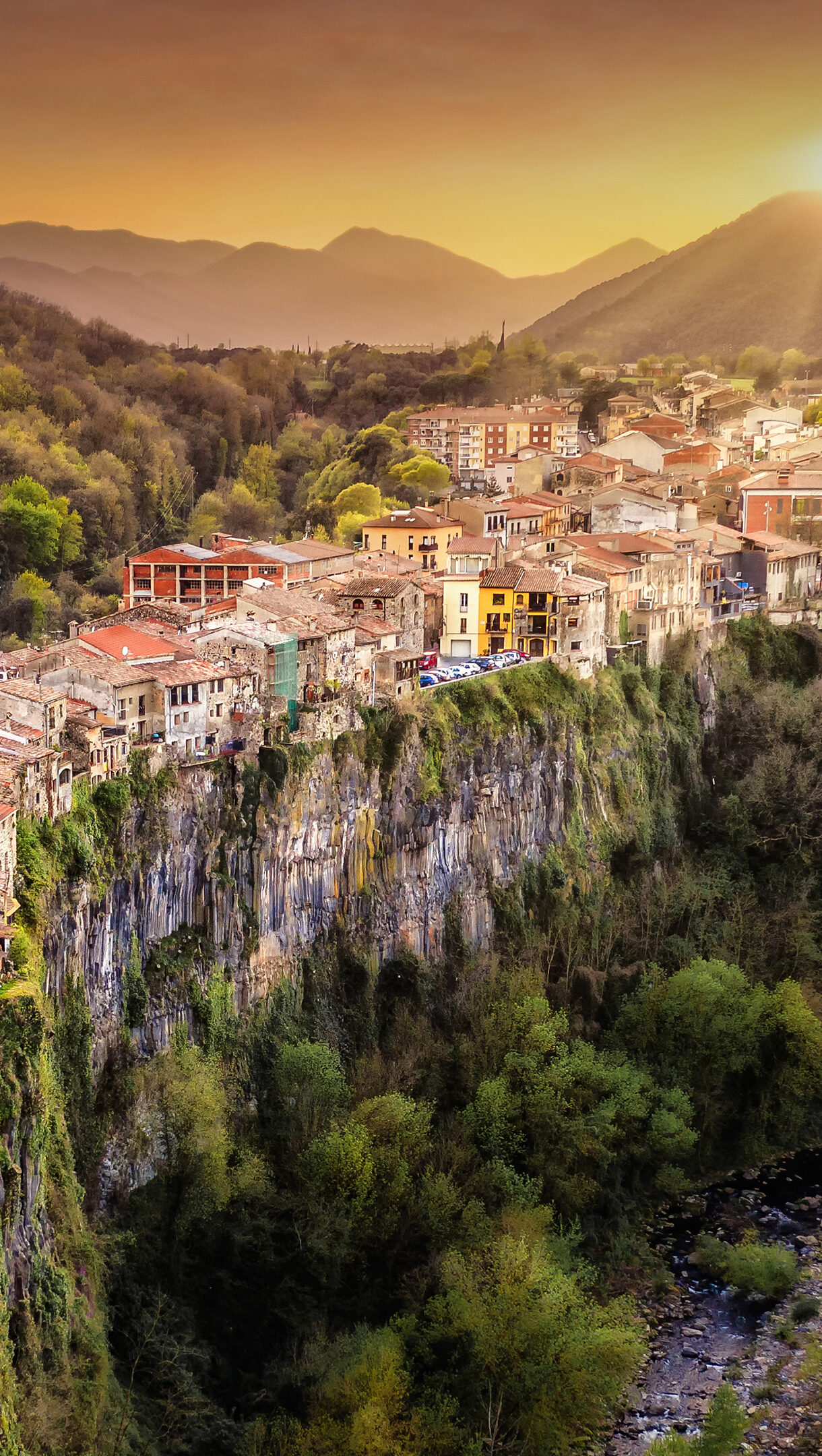 A magnificent 4K wallpaper highlights Castellfollit de la Roca, a historic village uniquely built on the edge of a towering basalt cliff in a verdant valley. The striking evening light bathes the ancient rooftops and emphasizes the dramatic columnar rock formations, creating a scene of serene grandeur.
