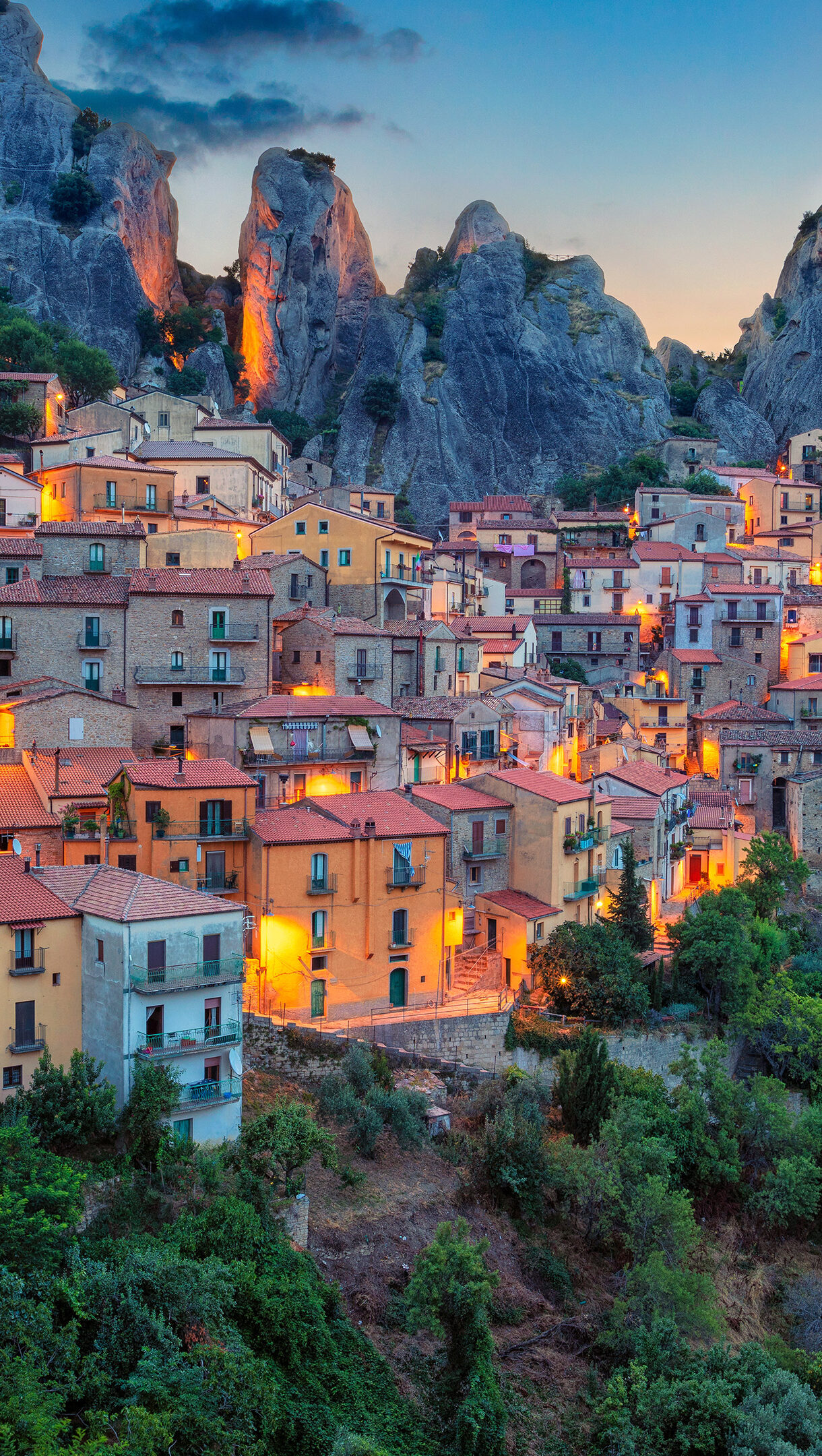 An enchanting 4K wallpaper depicts the charming Italian mountain village of Castelmezzano, built precariously into a steep, rocky mountainside. At sunset, the village lights glow warmly, contrasting beautifully with the dramatic, ancient rock formations bathed in the fading golden light and the vibrant orange-to-blue gradient of the twilight sky.