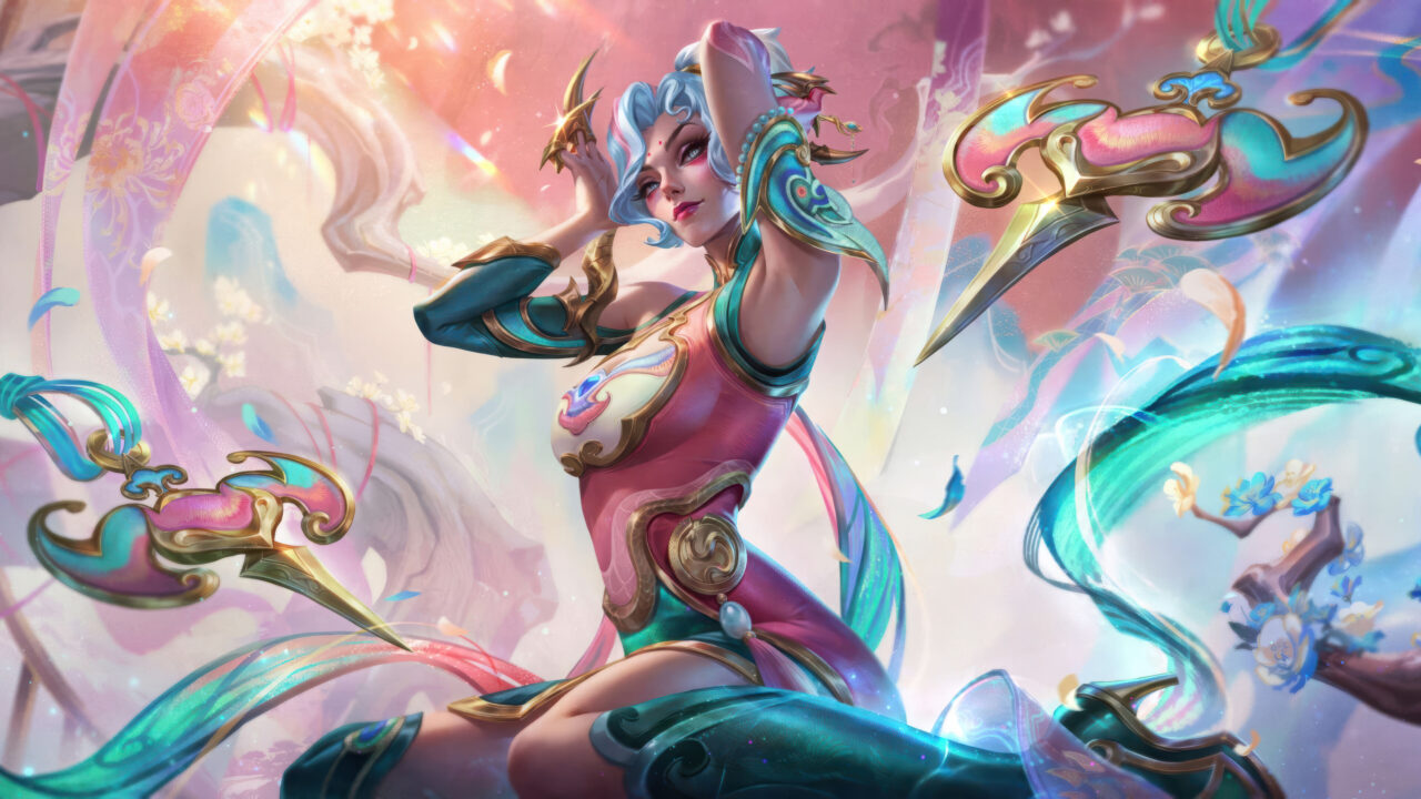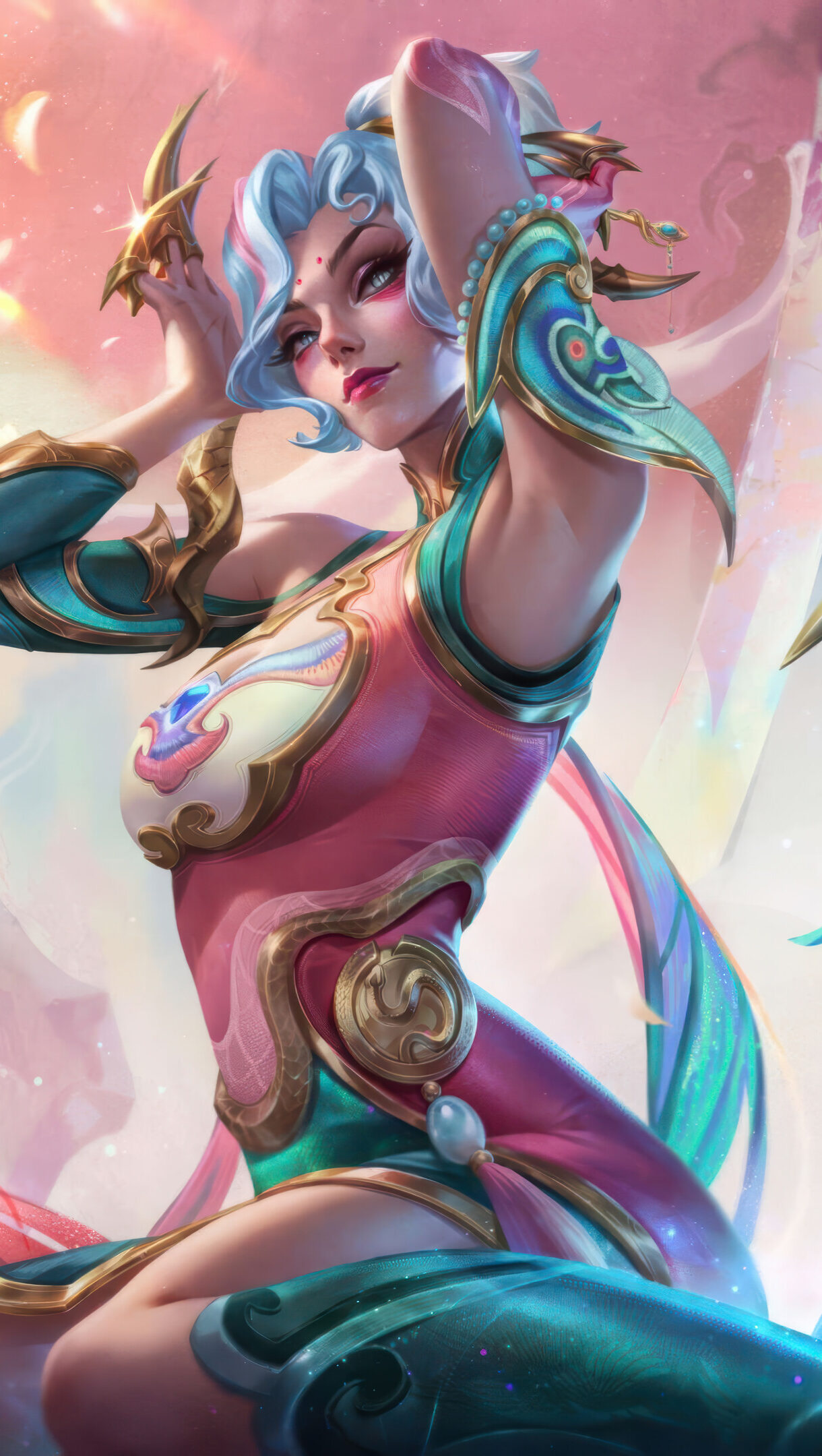 A mesmerizing 4K wallpaper featuring the Celestial Embroidery Evelynn skin from League of Legends, showcasing Evelynn in an alluring celestial-themed outfit adorned with intricate embroidery and glowing, ethereal energy. Her mysterious and seductive presence against a cosmic backdrop makes this wallpaper perfect for fans seeking a divine yet dangerous aesthetic for their screen. Simply click the download button to bring this masterpiece to life on your screen as a desktop wallpaper or save it for later in your picture collection.