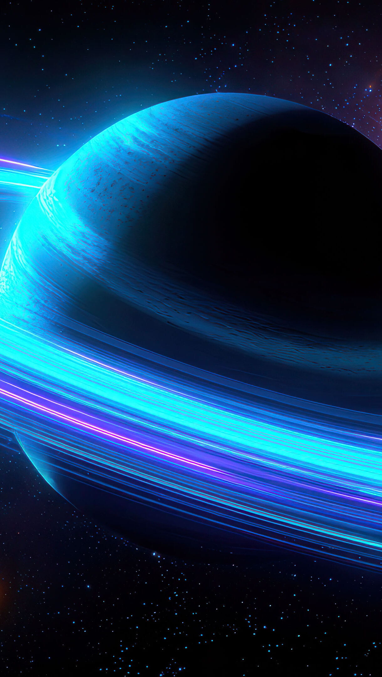 A breathtaking 4K wallpaper showcasing a large, dark-hued ringed planet dominating the foreground of a deep space scene, with smaller celestial bodies scattered in the distance. The planet's wide rings glow intensely with streaks of vibrant neon blue and electric purple, casting an otherworldly radiance that defines the cosmic and mysterious mood.