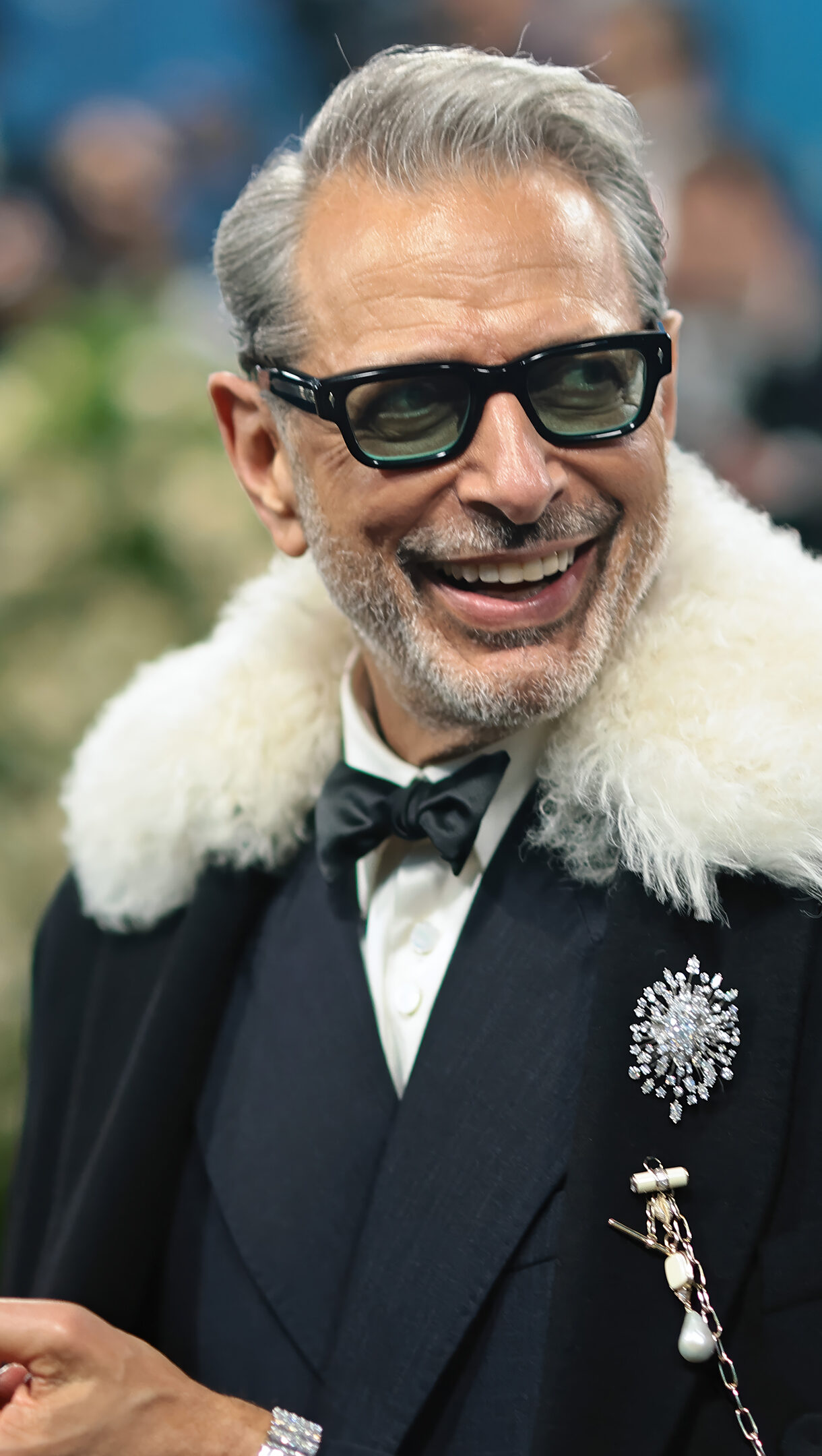 An iconic 4K wallpaper features a charming Jeff Goldblum smiling widely at the Met Gala, dressed in a distinctive black suit with a prominent white fluffy collar. His dark sunglasses and sparkling brooches enhance his eccentric elegance, reflecting a joyful and approachable mood.