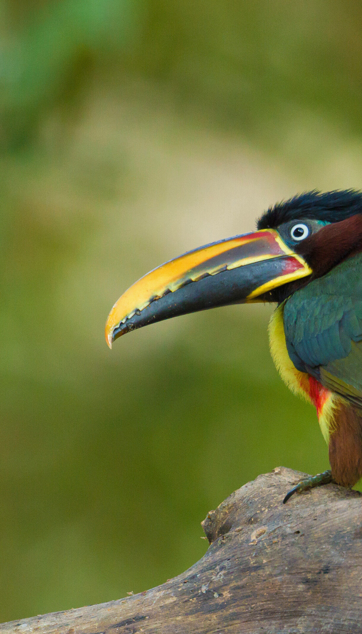 A vibrant 4K wallpaper showcasing a Chestnut-eared Aracari perched on a textured log in the lush Pantanal region of Brazil. Its vivid green, yellow, red, and black plumage, along with its unique bi-colored bill, stands out sharply against the soft, blurred jungle backdrop, creating a captivating tropical mood.