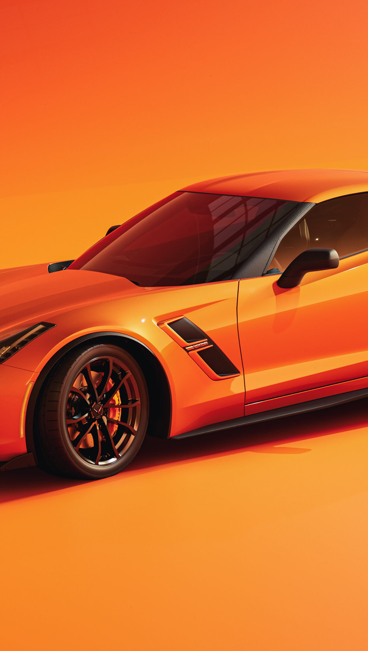 A striking 4K wallpaper featuring an orange Chevrolet Corvette. The sleek design and vibrant color of the car create a bold aesthetic, perfect for car enthusiasts looking for an eye-catching desktop or mobile background.