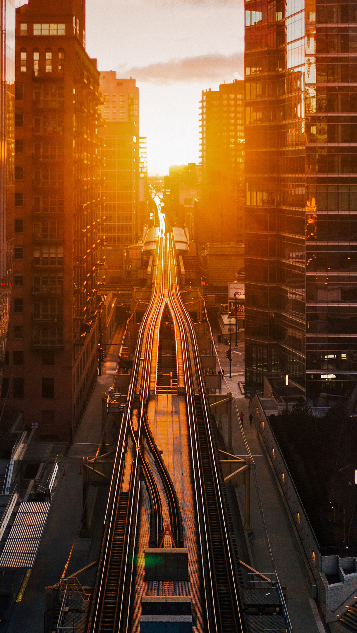 A captivating 4K wallpaper showcases the Chicagohenge phenomenon, with elevated train tracks cutting through a vibrant Chicago, Illinois cityscape. The golden sun brilliantly bathes the urban canyon and reflects off the towering glass buildings, creating a warm, dramatic glow across the city.