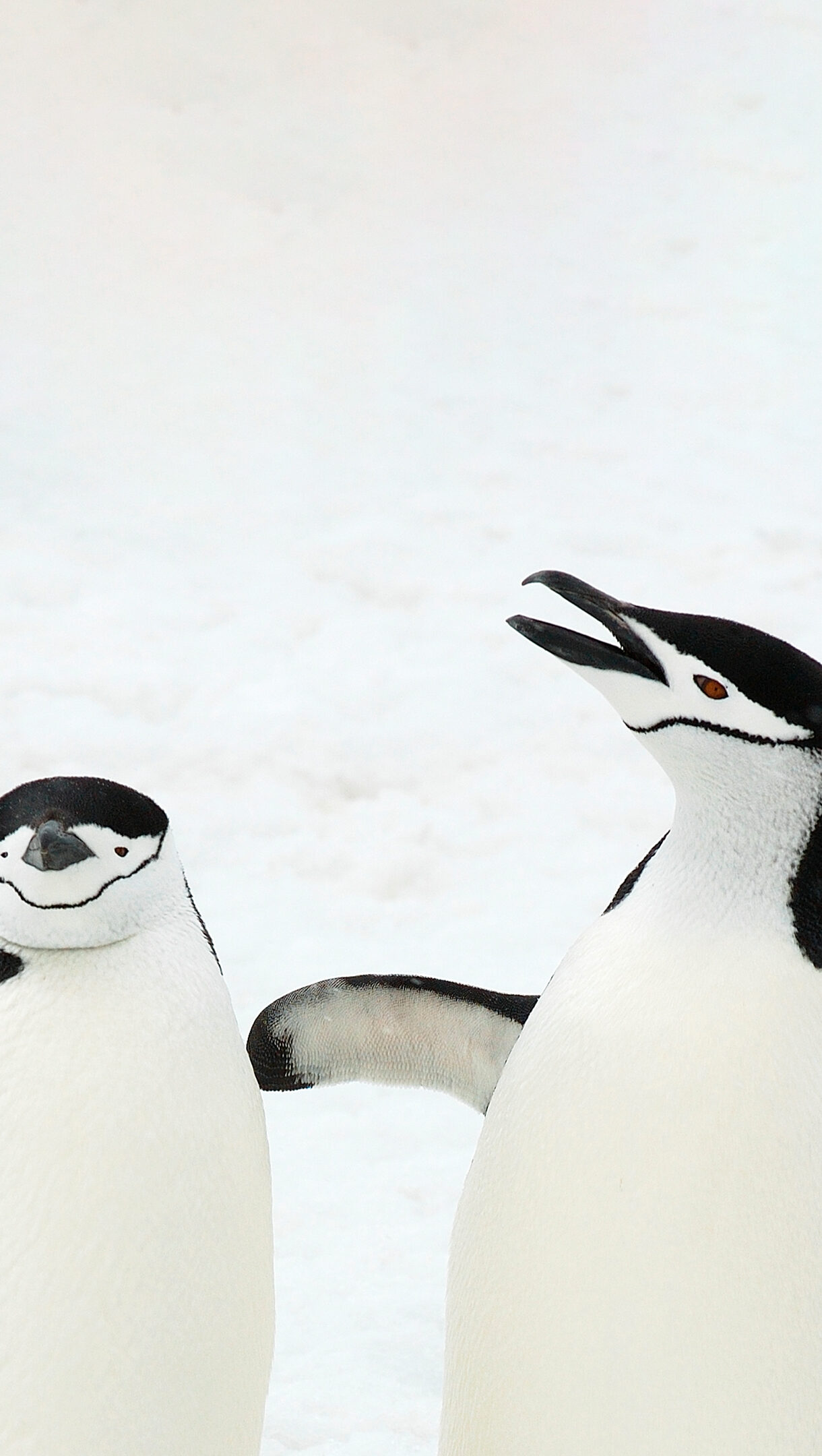 A captivating 4K wallpaper showcasing two Chinstrap Penguins standing prominently on pristine white snow in the South Sandwich Islands. The stark contrast of their black and white plumage against the minimalist snowy expanse highlights one penguin observing calmly, while the other calls out with an open beak and extended flippers, creating a lively moment.