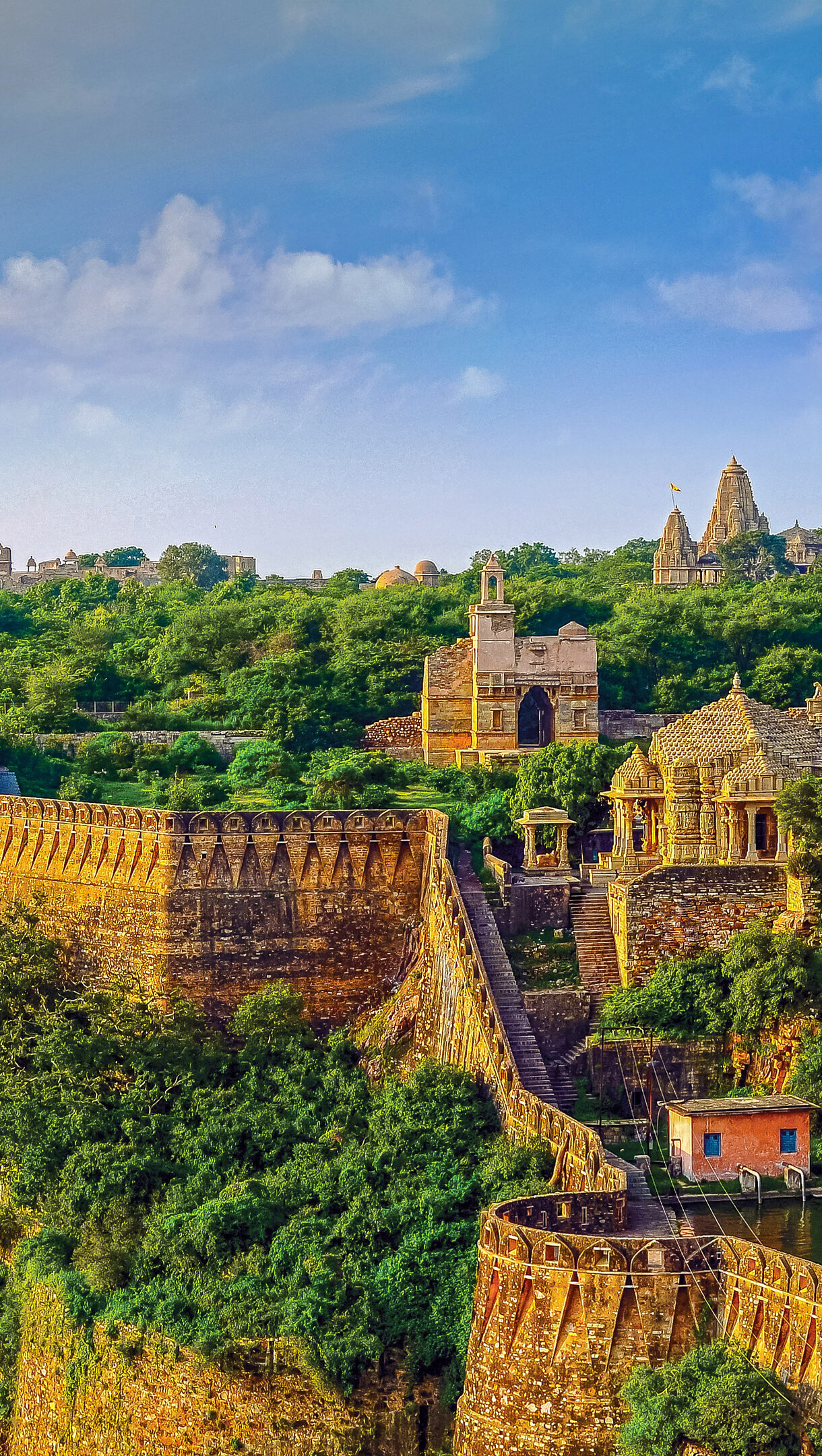 A captivating 4K wallpaper of the sprawling Chittorgarh Fort in India, an historic hilltop complex nestled amidst lush green hills under a bright sky. Golden sunlight illuminates the ancient stone walls and ornate temples, casting rich hues that highlight the complex's majestic scale and timeless beauty.