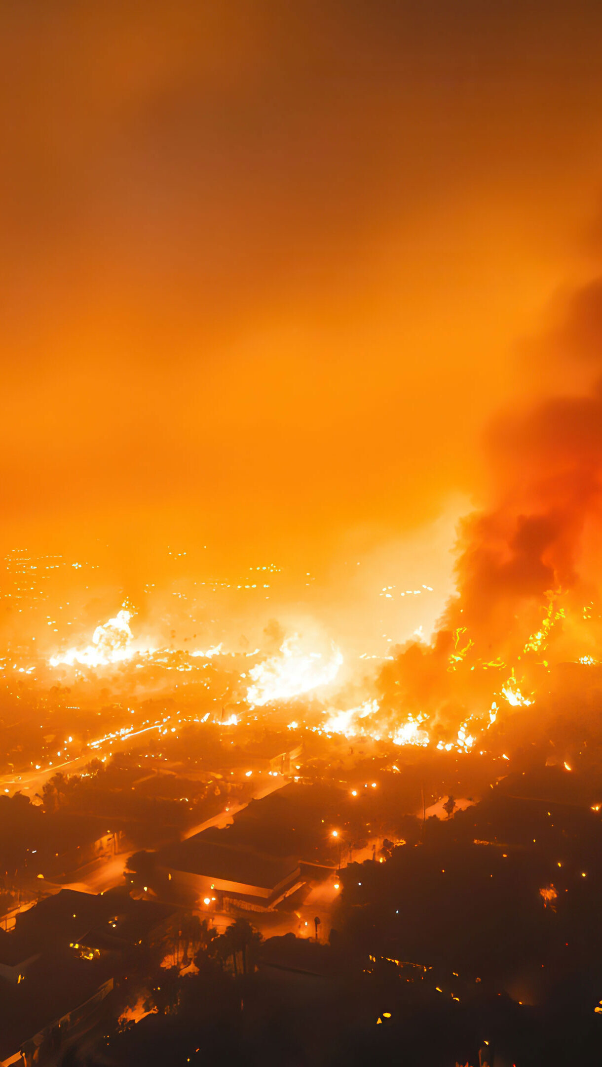 A stunning 4K wallpaper featuring an AI-generated depiction of a city engulfed in flames. The fiery hues and dramatic urban landscape create a cinematic and apocalyptic atmosphere, making it a striking choice for your desktop or mobile background.