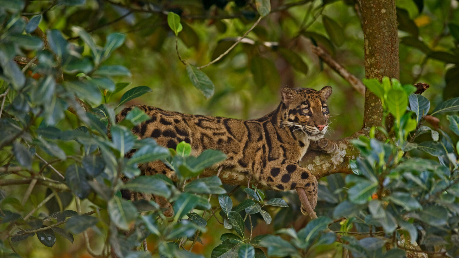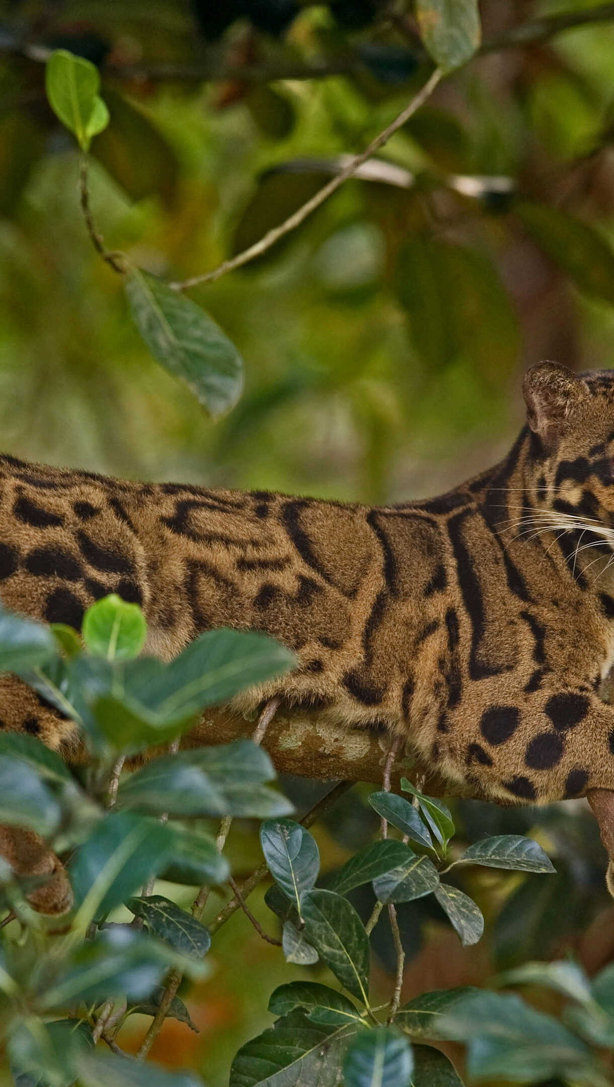 A captivating 4K wallpaper features a Clouded Leopard calmly resting on a thick tree branch, partially concealed by lush green leaves in a dense forest. Its strikingly patterned coat, with its distinctive cloud-like markings, perfectly blends with the dappled sunlight and verdant surroundings, while its observant eyes suggest a moment of serene alertness.