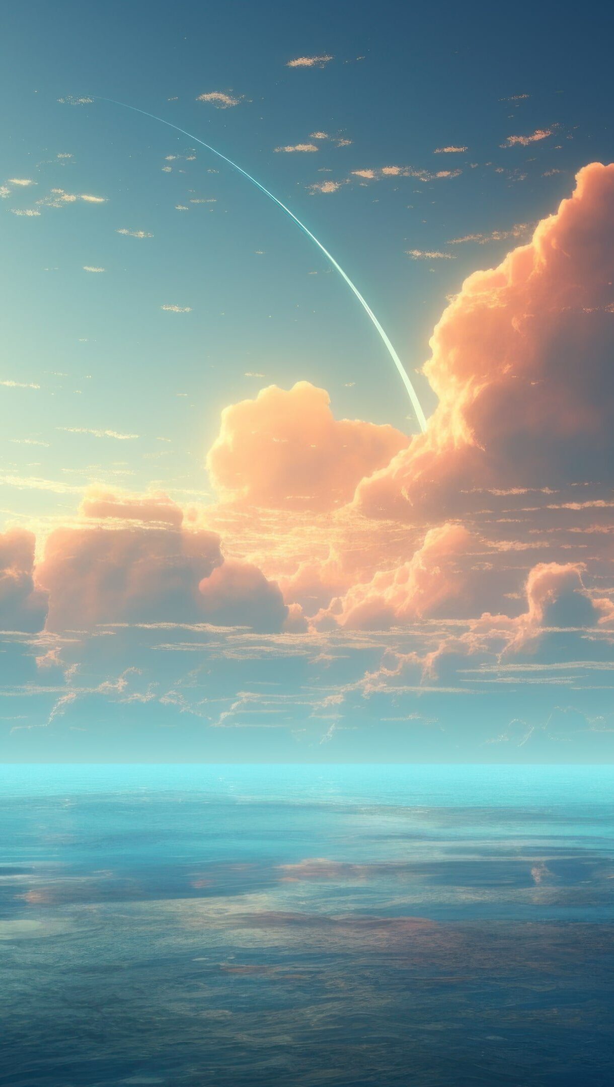 A breathtaking 4K wallpaper, crafted by AI, capturing the stunning moment where fluffy clouds gently meet the tranquil sea, creating a serene coastal view that embodies the beauty of nature and the peaceful ambiance of the landscape. Simply click the download button to bring this masterpiece to life on your screen as a desktop wallpaper or save it for later in your picture collection.