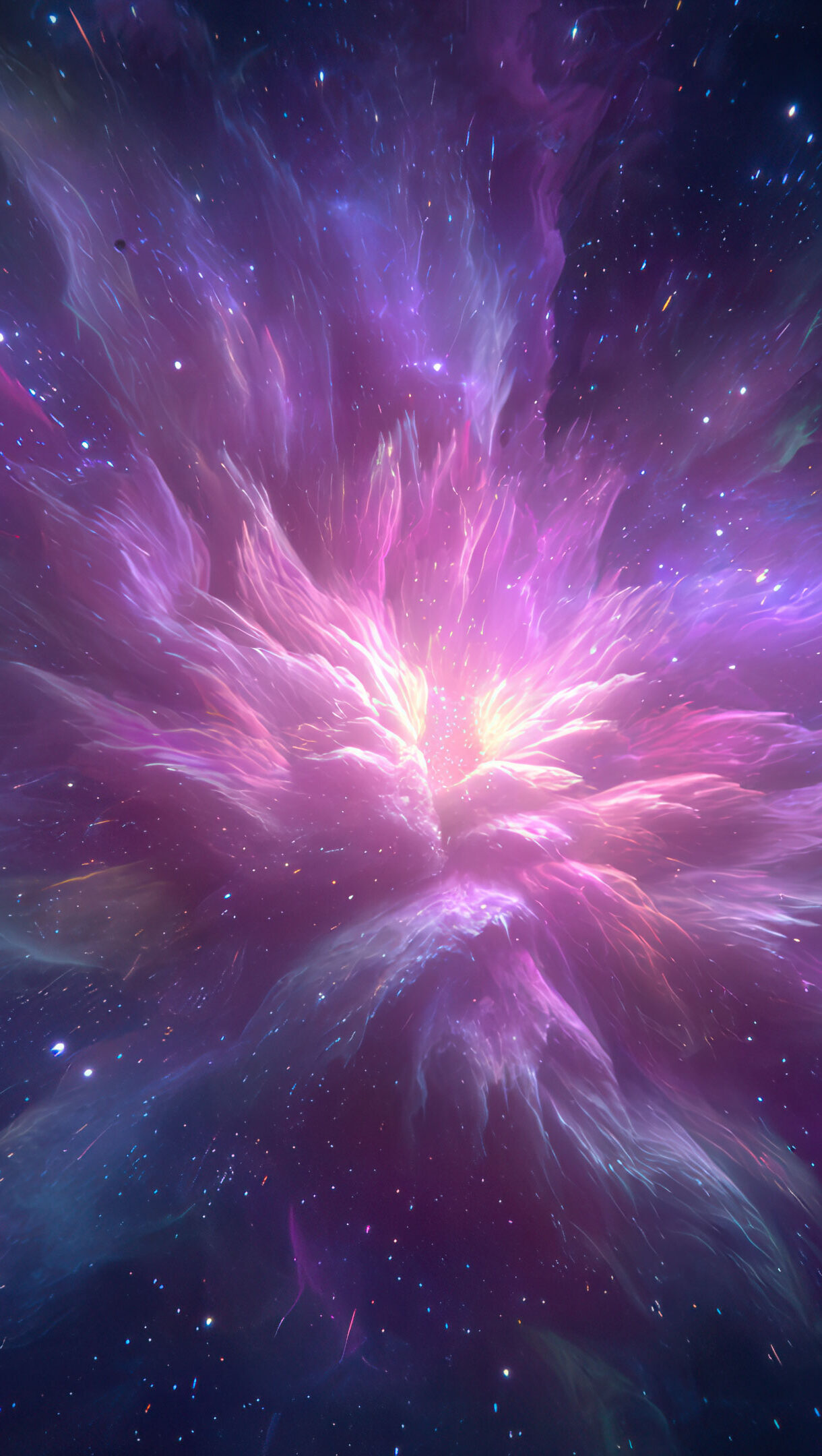 A mesmerizing 4K wallpaper unfolds, showcasing a magnificent cosmic nebula bursting with light in the vastness of deep space, accented by distant stars and a subtle planet. The central explosion of brilliant white and fuchsia light emanates in dramatic, swirling tendrils of purple and blue gas, creating an awe-inspiring display of cosmic power.