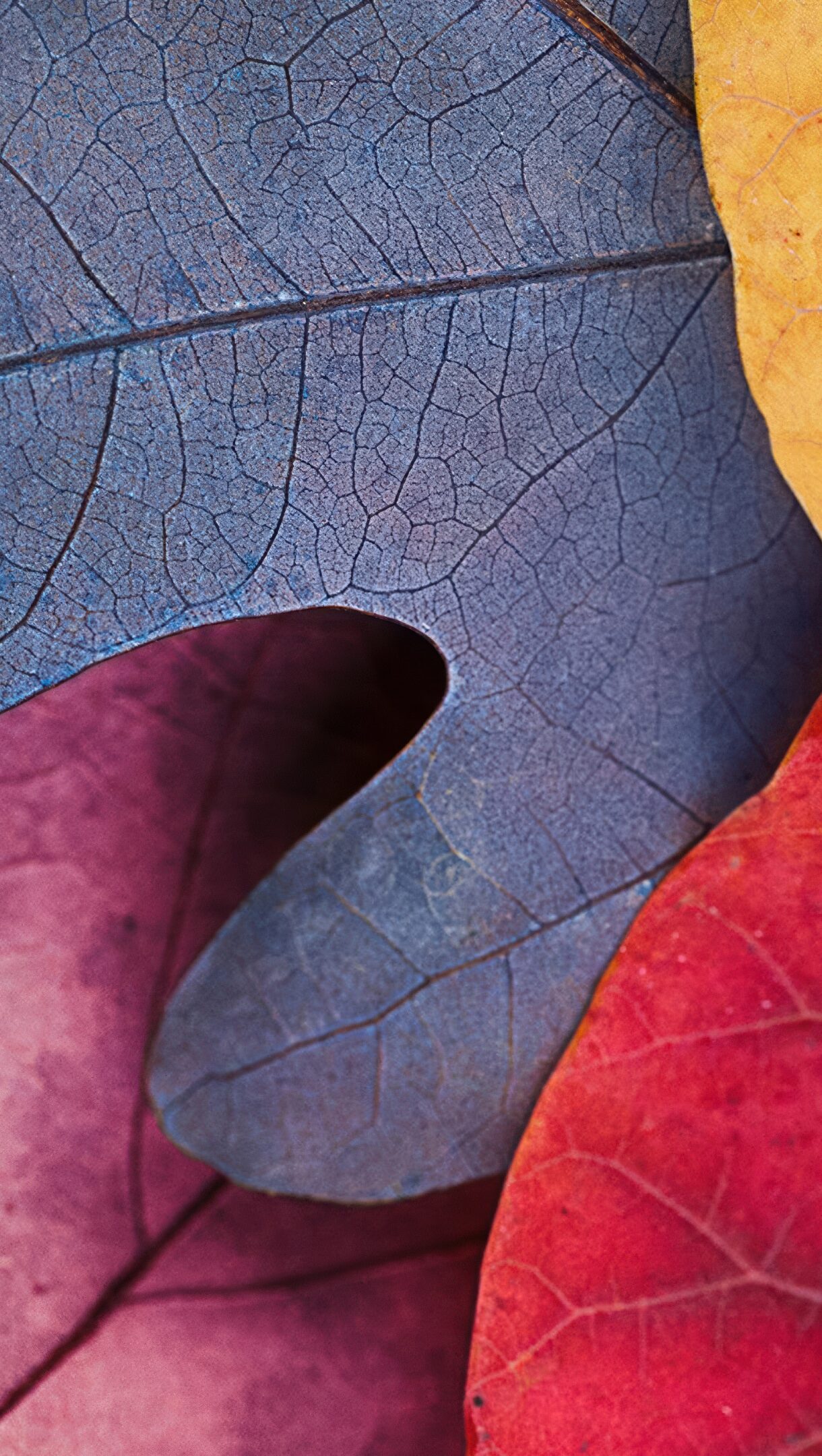 An intricate 4K wallpaper showcasing a close-up, macro view of three vibrant autumn leaves. Their distinct hues of deep red, warm orange, and muted blue-purple display fine vein textures and overlapping patterns, creating a rich natural mosaic.