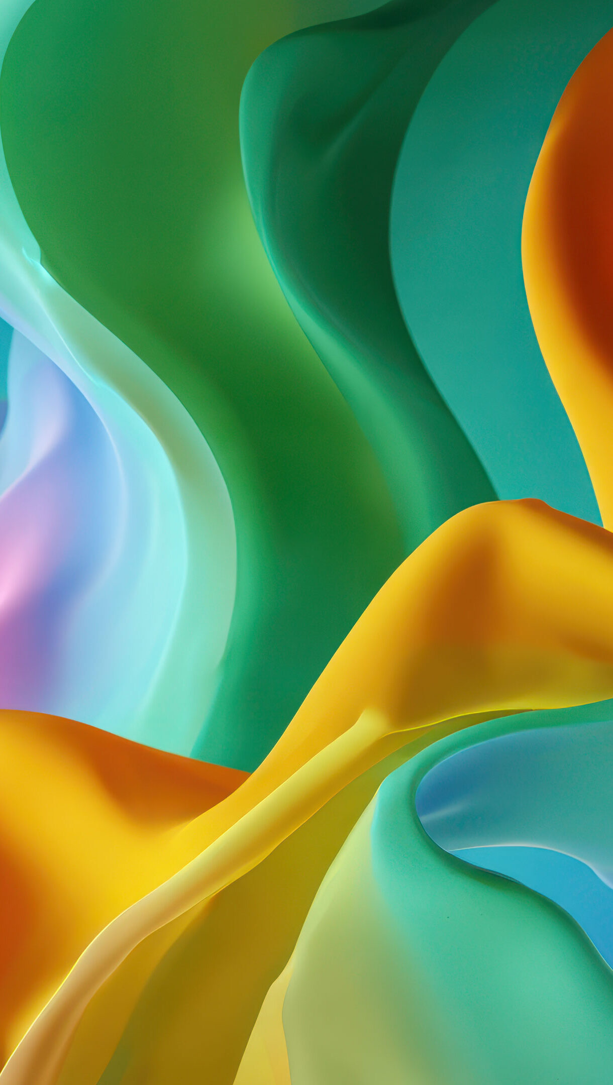 A captivating 4K wallpaper presents vibrant, flowing forms of digital art, swirling gracefully against a soft blue background. The translucent layers of yellow, green, orange, pink, and blue blend seamlessly, creating a serene yet dynamic interplay of light and shadow that enhances the fluid abstract design.