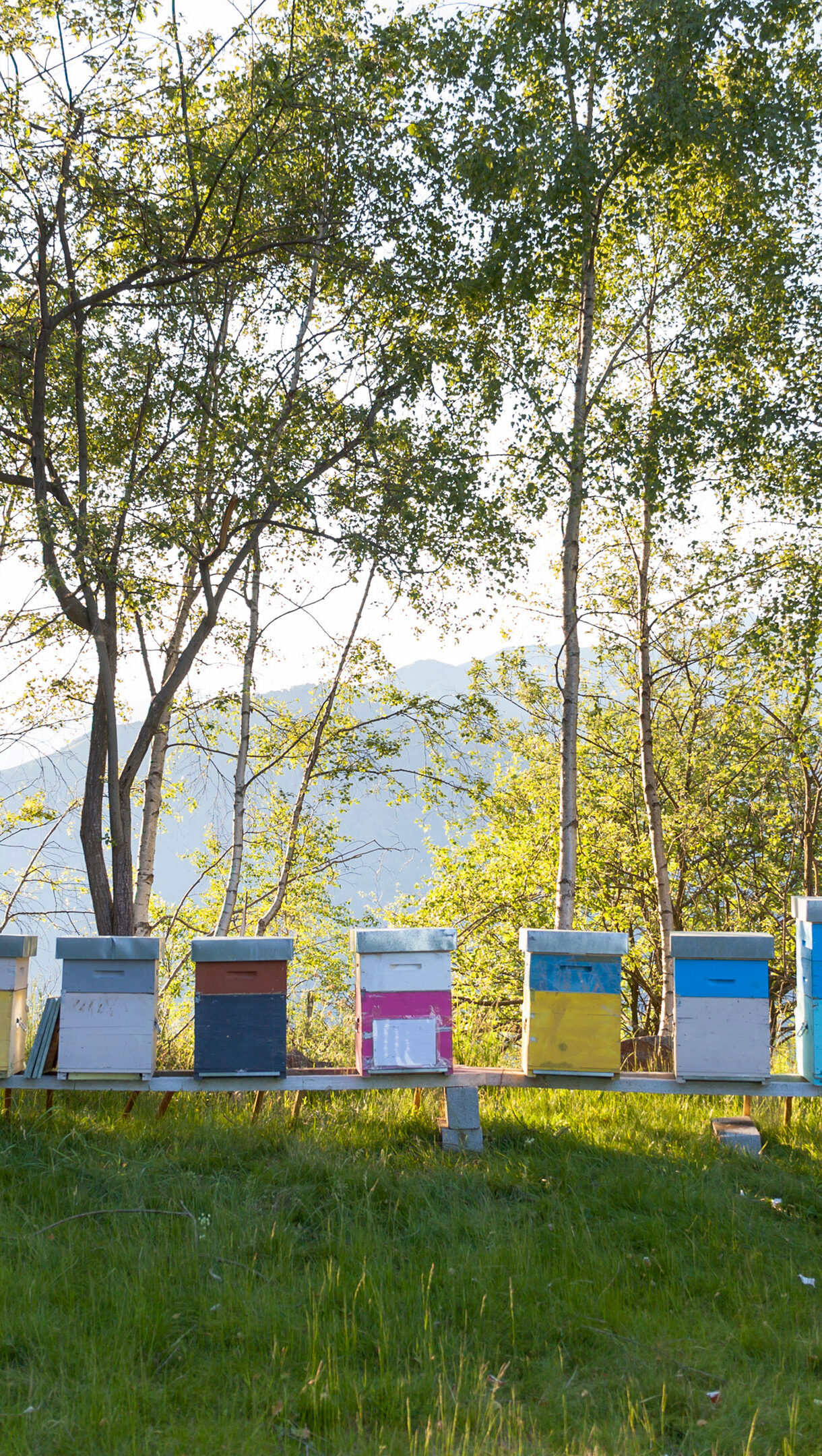 A picturesque 4K wallpaper features colorful Italian beehives lined neatly on a platform in a sun-drenched, grassy landscape. The vibrant hues of the hives stand out against the lush green foreground and the bright foliage of trees, with soft mountains in the distant background.
