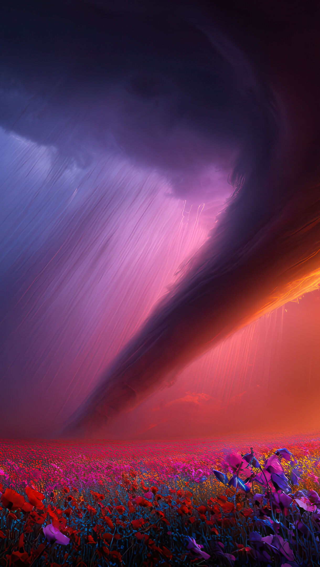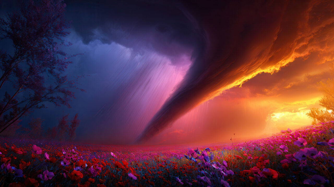 An otherworldly 4K wallpaper showcases a vibrant vortex descending into a vast field of colorful wildflowers beneath a dramatically divided sky. The striking visual lies in the stark division of the sky, with tempestuous dark blues merging into fiery oranges, an extraordinary contrast mirrored by the colorful vortex and the field's blooming flowers below.