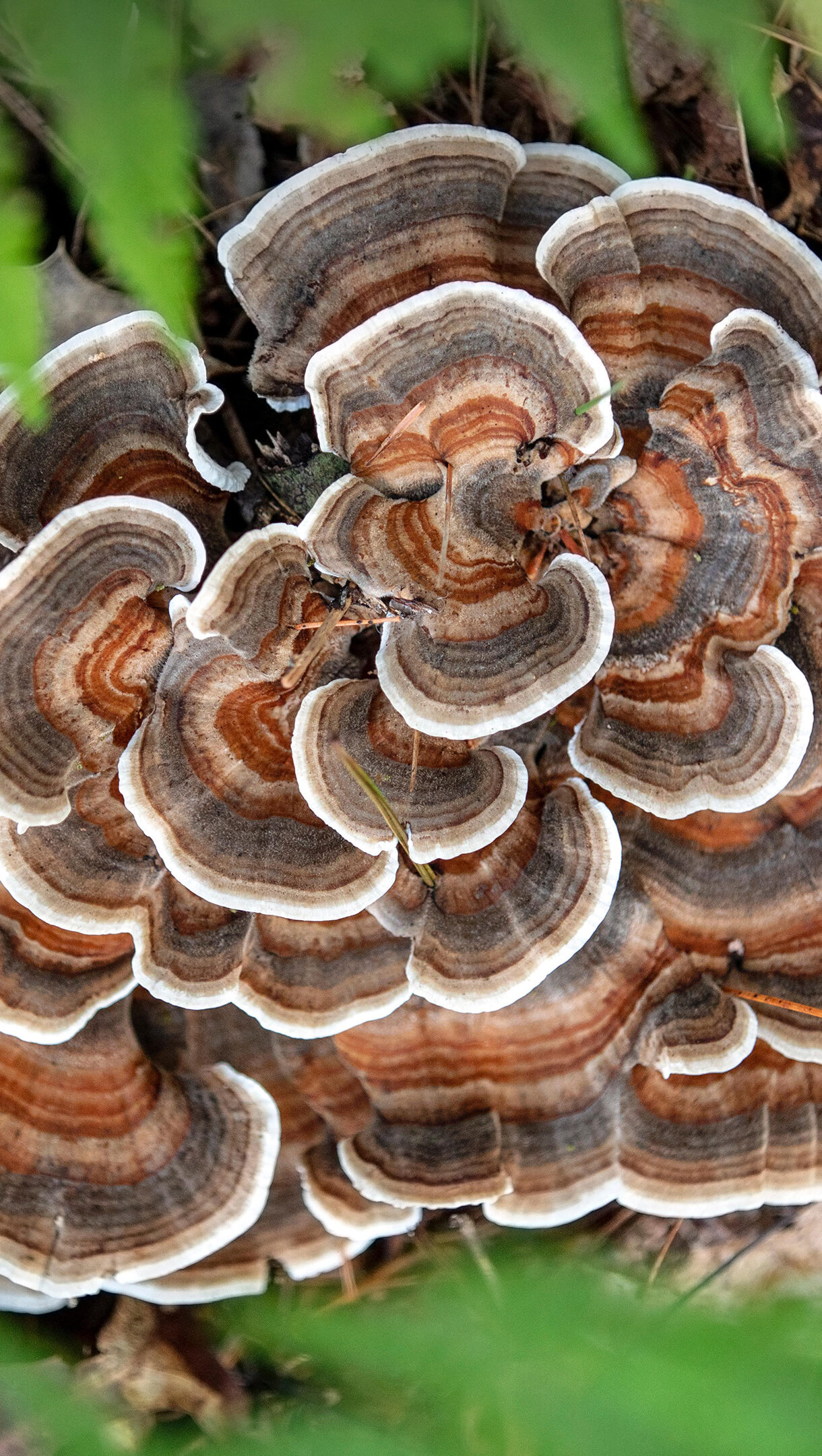 A remarkable 4K wallpaper presents a vibrant Turkey Tail Mushroom with distinct concentric bands thriving on the forest floor in Brevard, North Carolina. Its rich browns, oranges, and whites are beautifully framed by soft, blurred green foliage, highlighting its intricate texture and natural beauty.