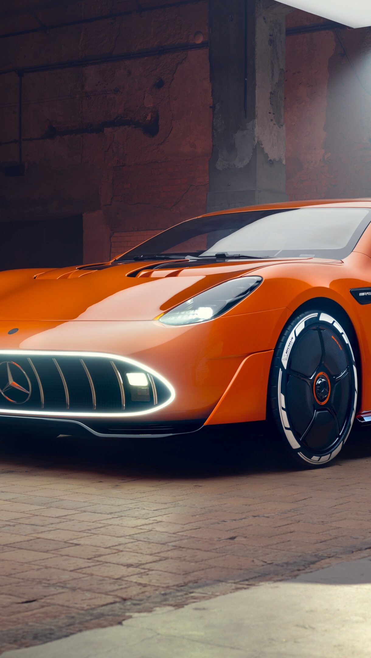 An exhilarating 4K wallpaper reveals a high-performance Mercedes-AMG GT concept car, its aggressive silhouette posed in a sophisticated, dark automotive studio. Sharp, vibrant red accent lighting streaks across its aerodynamic bodywork, creating a dynamic contrast against the car's reflective dark finish and hinting at its raw power.