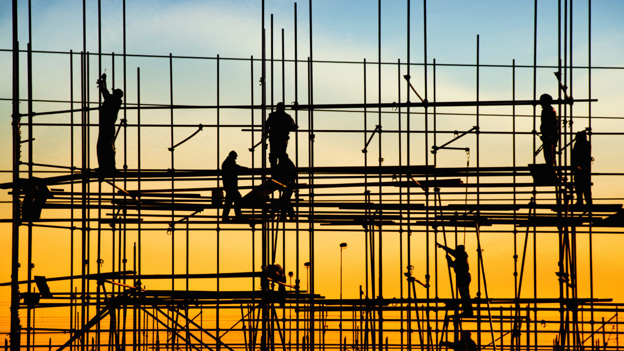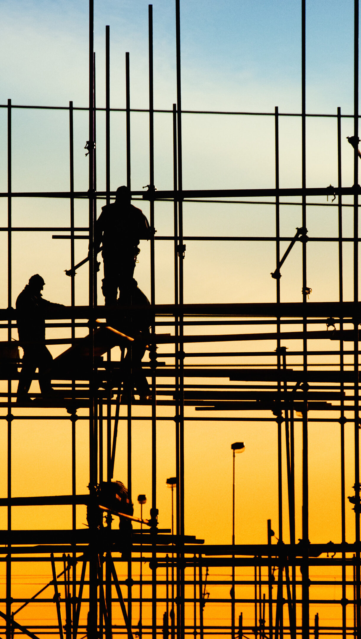 A powerful 4K wallpaper capturing construction workers diligently at work on extensive scaffolding. Their strong silhouettes are sharply defined against a dramatic sunset sky, transitioning from an intense orange glow at the bottom to a soft, cool blue at the top, highlighting the quiet end of a hardworking day.