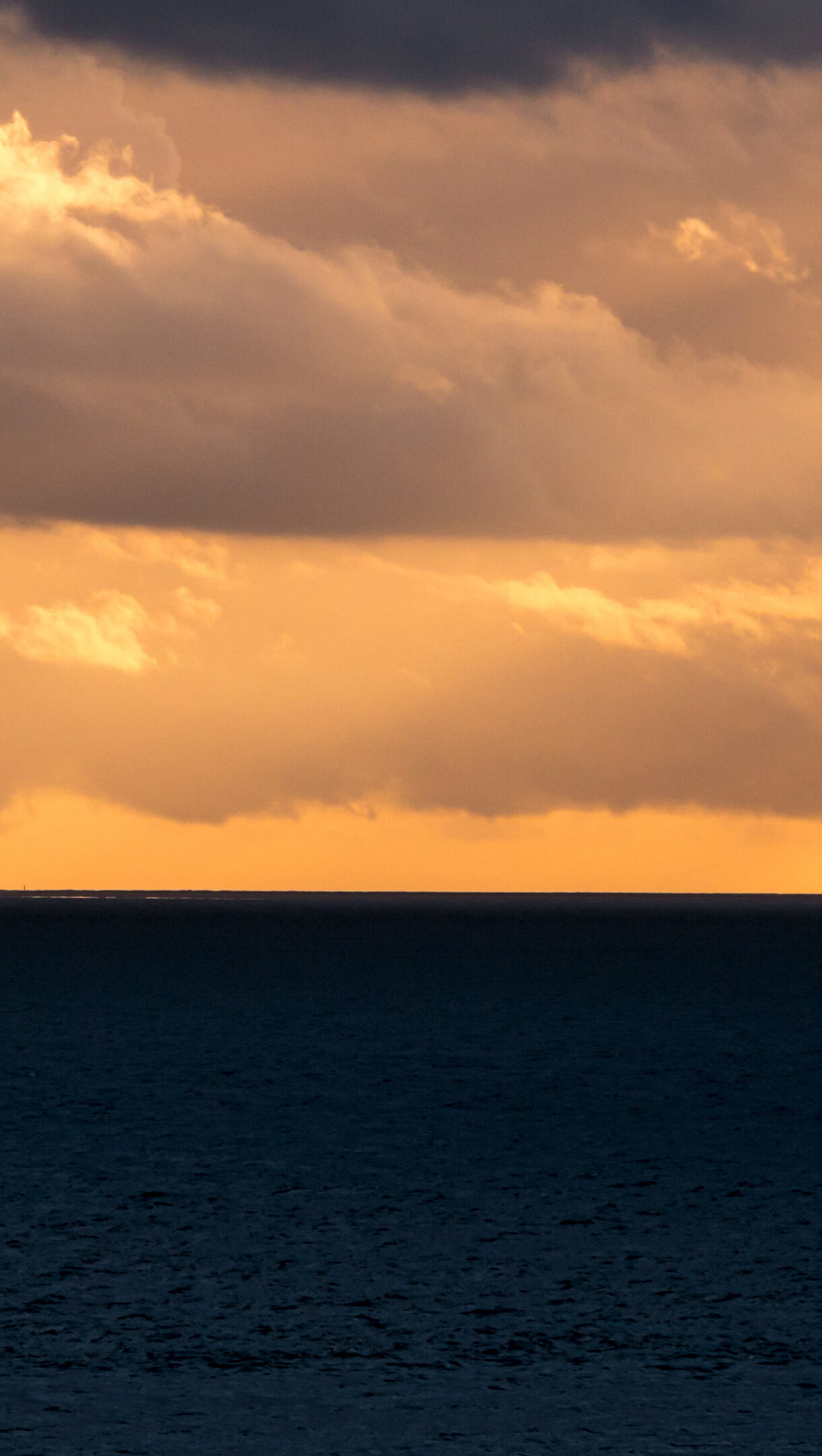 An evocative 4K wallpaper capturing the Cordouan Lighthouse as a striking silhouette against a sunset over the Atlantic Ocean off Royan, France. The vast dark expanse of the ocean below contrasts sharply with the radiant, golden-orange sky, where dramatic clouds catch the last rays of light and cast deep shadows, creating a serene yet powerful mood.