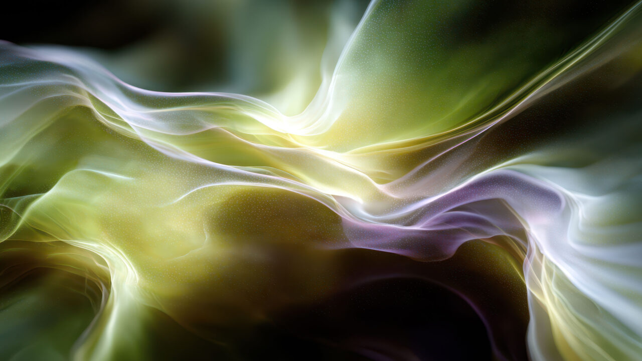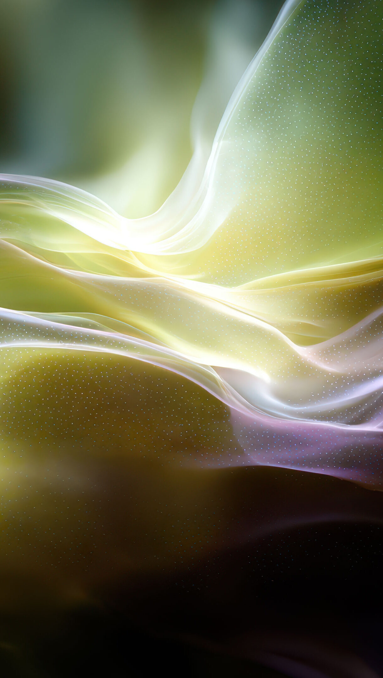 A mesmerizing 4K wallpaper depicting fluid, abstract gradients that evoke a cosmic aurora. Translucent, shimmering waves of light green, golden yellow, and soft purple flow across the dark background, accented by subtle, star-like speckles that enhance its ethereal depth.