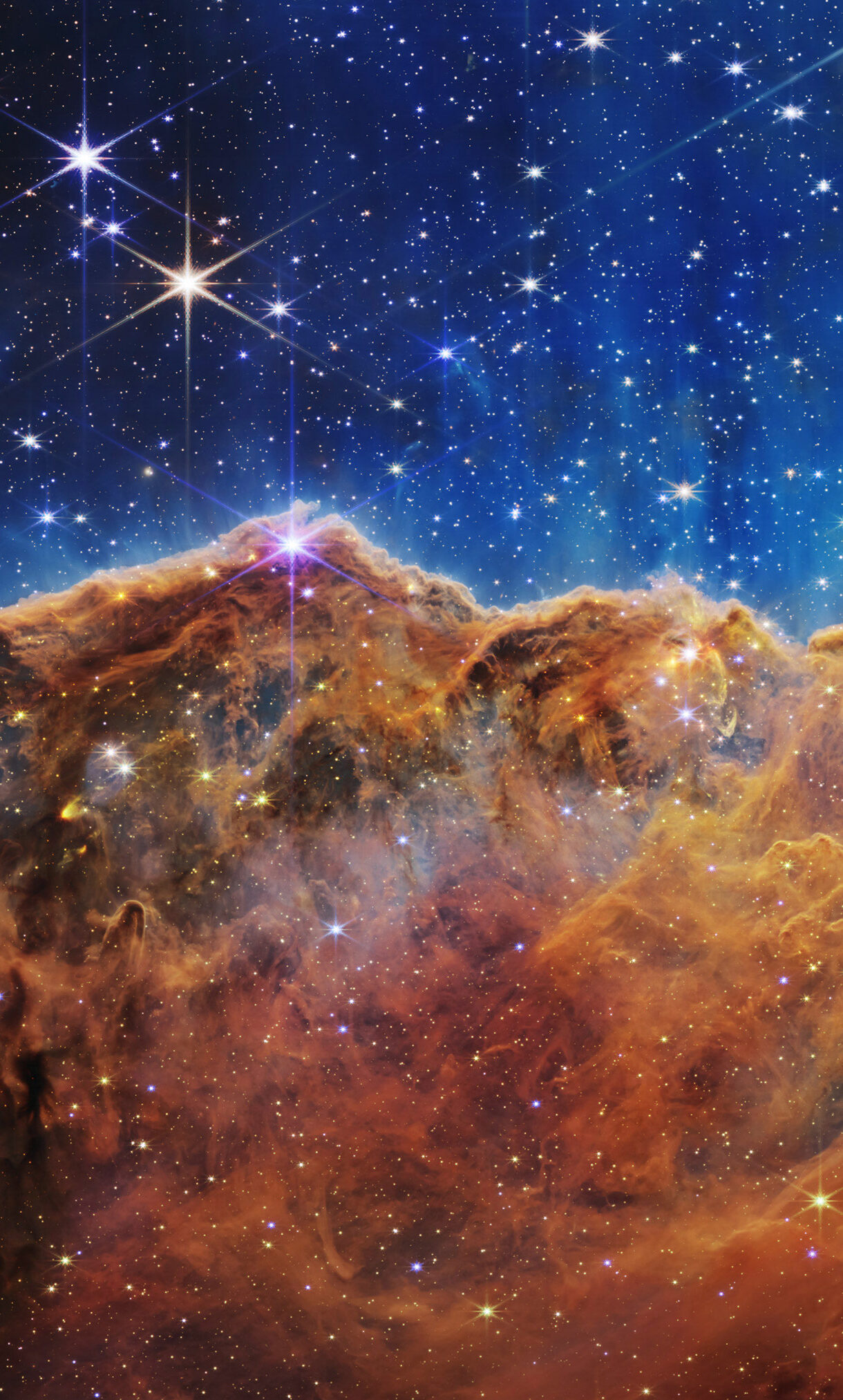A breathtaking 4K wallpaper revealing the majestic Cosmic Cliffs of the Carina Nebula, a towering landscape of interstellar gas and dust within a star-studded expanse of deep space. Vibrant pillars of glowing orange and red nebula rise dramatically against a profound blue-black sky, punctuated by countless brilliant, distant stars that evoke a sense of immense cosmic creation.