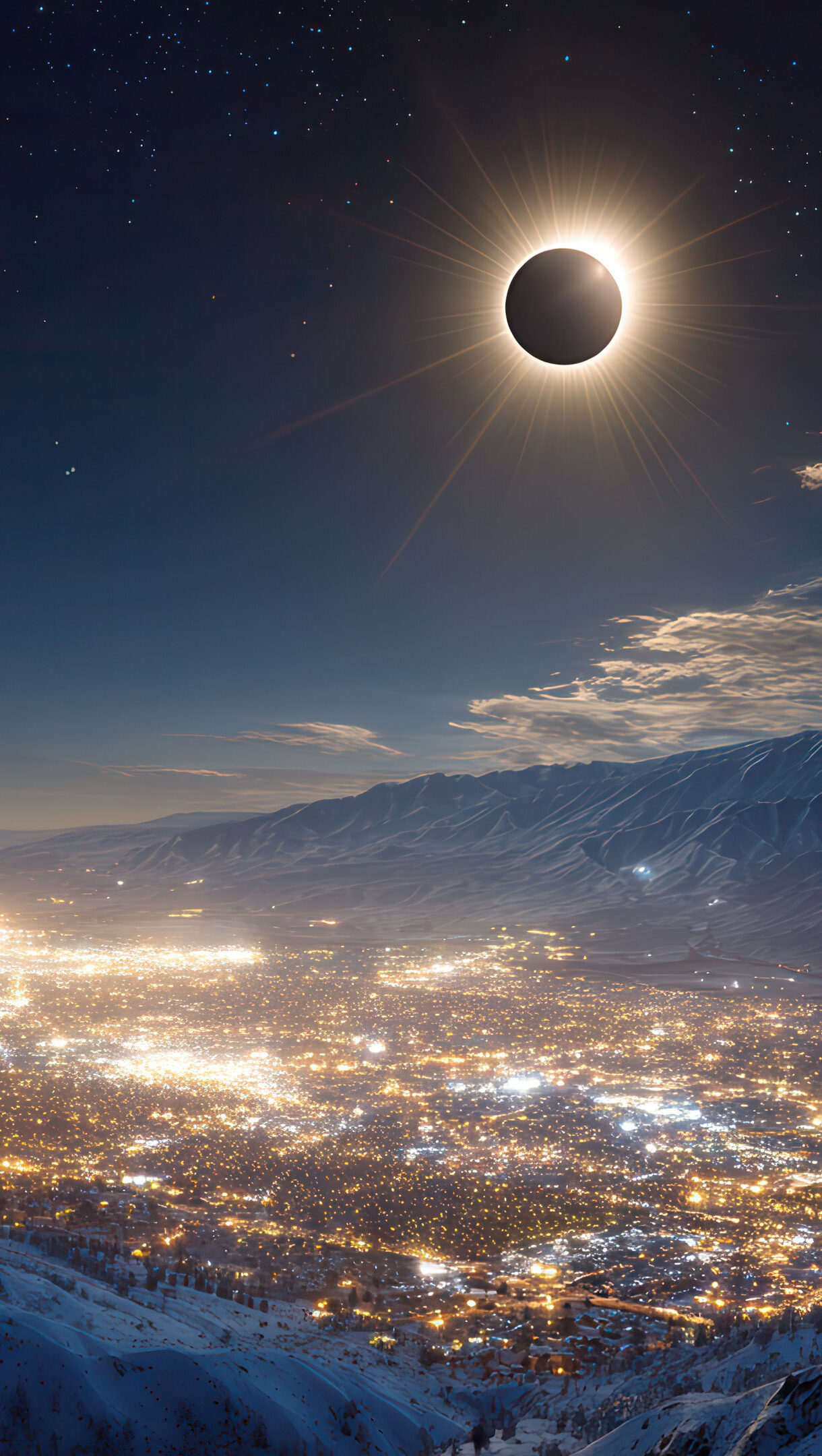 A mesmerizing 4K wallpaper showcases a total solar eclipse with a brilliant corona radiating above a vast, illuminated city nestled within a snow-covered mountain valley under a starry night sky. The intense glow of the eclipse powerfully contrasts with the warm, scattered city lights and the cool, dark blue hues of the rugged, snow-capped peaks, creating a majestic and otherworldly nocturnal scene.