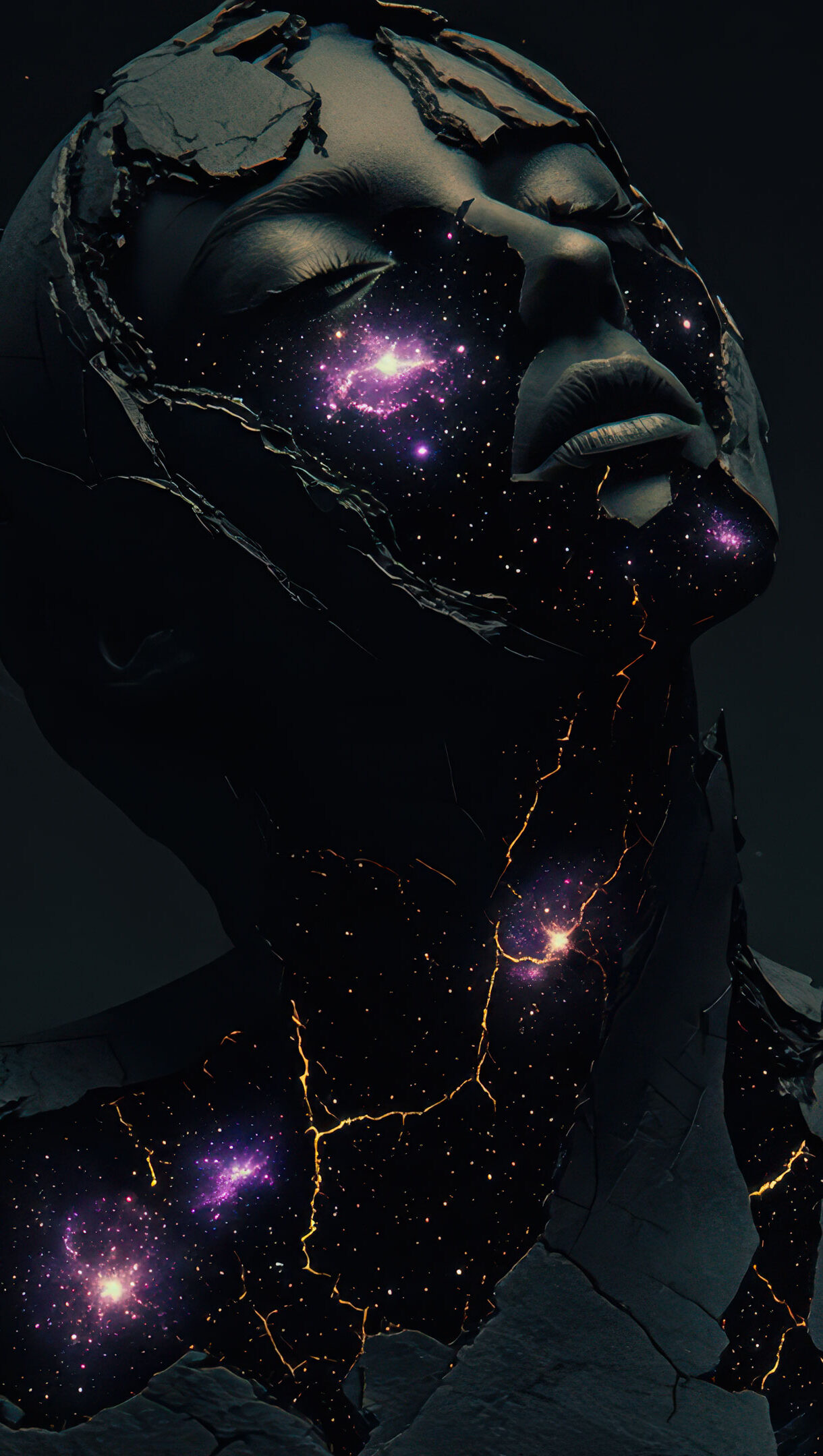 An otherworldly 4K wallpaper featuring a Black Starstone Cosmic Goddess, her serene form emerging from a deep, dark cosmic setting. Through the dramatic cracks in her starstone skin, radiant galaxies glow with purples, golds, and countless tiny stars, evoking a powerful sense of universal connection and quiet wonder.