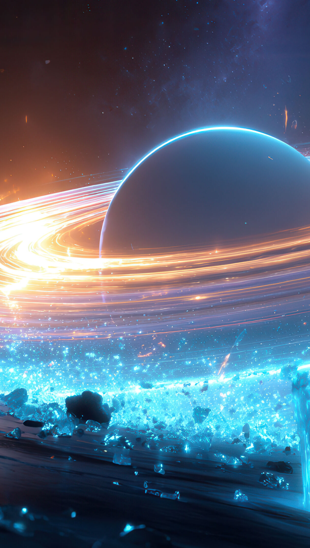 A cosmic 4K wallpaper unveils a colossal, dark planet adorned with luminous rings, orbited by sparkling azure shards within a boundless, starry expanse. The stunning interplay of the planet's brilliant golden-orange core and its cool, electric blue outer rings, coupled with glowing azure crystalline shards in the foreground, evokes a powerful, ethereal cosmic energy.