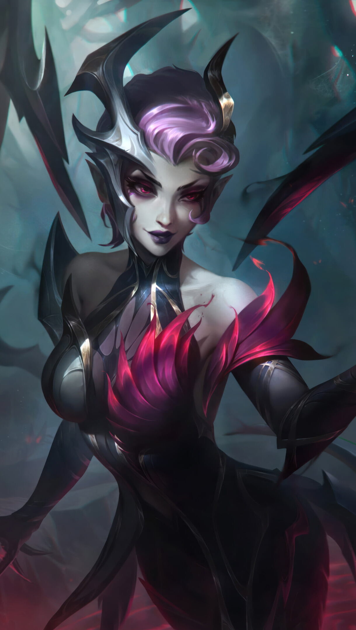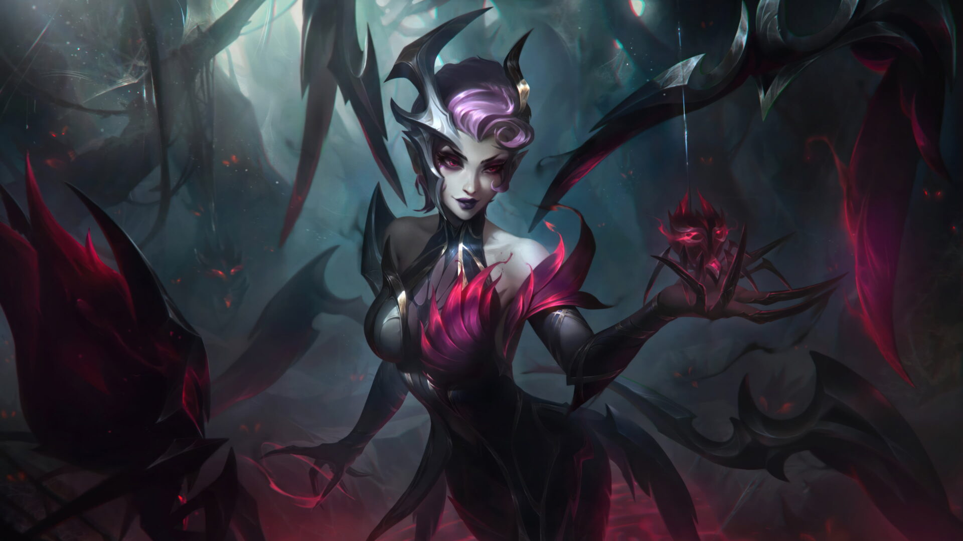 A spellbinding 4K wallpaper showcasing the alluring Coven Elise skin, featuring Elise, the Spider Queen, immersed in dark mysticism within the mystical world of League of Legends. Simply click the download button to bring this masterpiece to life on your screen as a desktop wallpaper or save it for later in your picture collection.