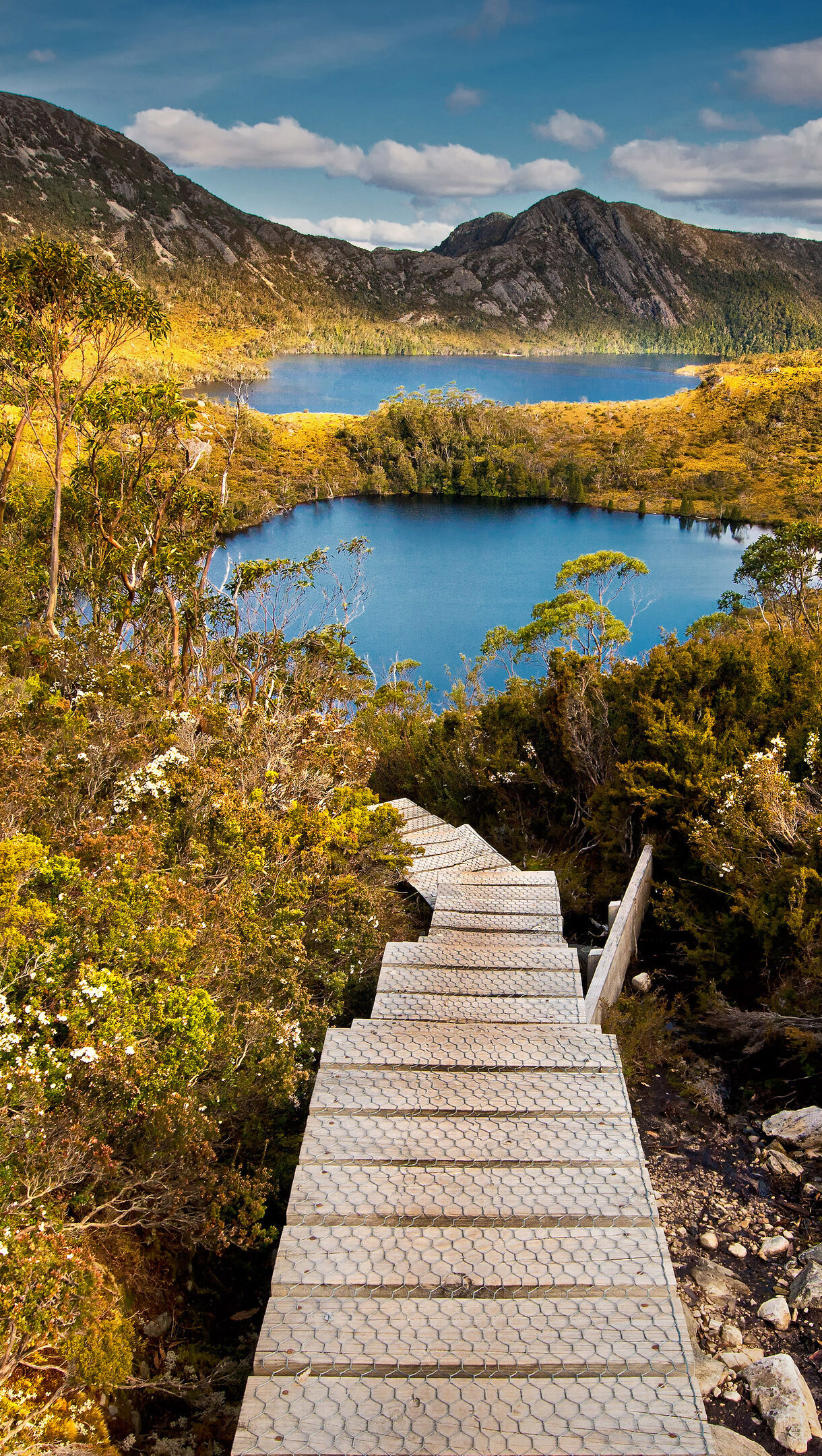 A breathtaking 4K wallpaper captures a wooden boardwalk path descending through vibrant golden and green scrubland within Cradle Mountain-Lake St. Clair National Park, Tasmania, leading towards two clear blue lakes nestled amidst ancient mountains. The serene scene is defined by the striking contrast of the vivid blue lakes and the glowing golden and russet vegetation, all bathed in clear sunlight under a dynamic sky.