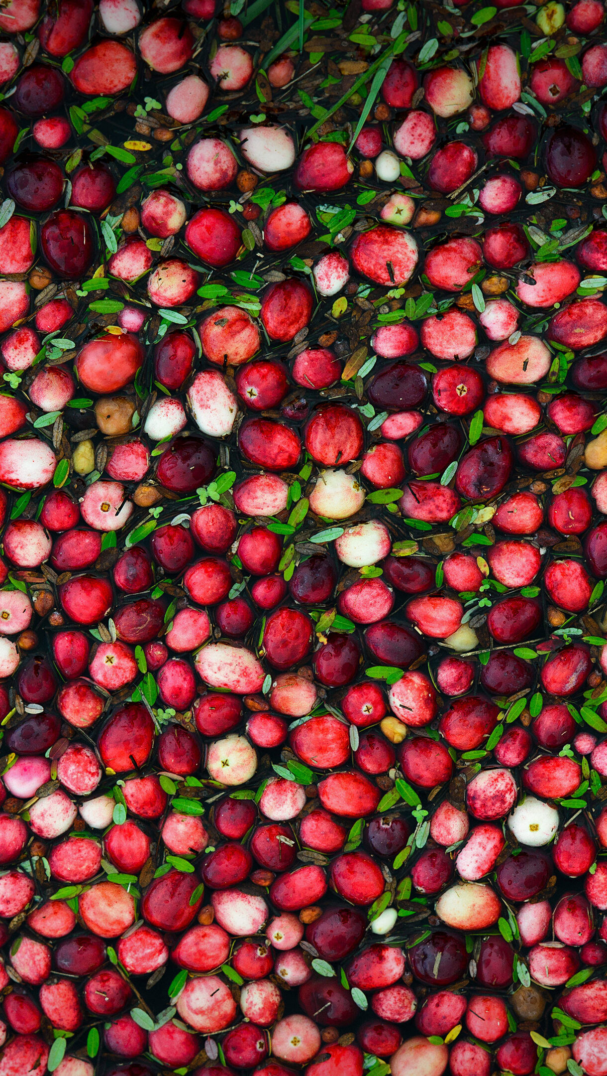 A captivating 4K wallpaper showcasing a dense field of crimson cranberries floating on dark water within a bog. The rich tapestry of reds, from deep burgundy to bright scarlet, intermingles with subtle green foliage, creating a vibrant and abundant seasonal harvest scene.