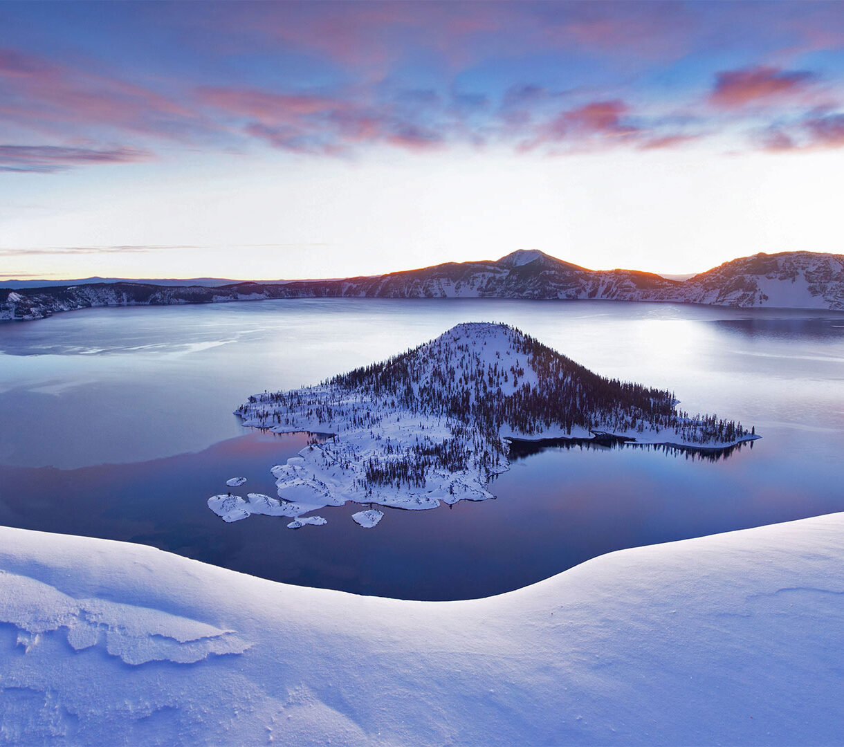 A majestic 4K wallpaper of Crater Lake, Oregon, showcasing its iconic caldera during a serene winter sunset with snow-dusted Wizard Island centered in the deep blue water. The horizon glows with soft orange and pink light, reflecting on the tranquil lake and casting a beautiful contrast against the pristine white snow covering the surrounding peaks and foreground.