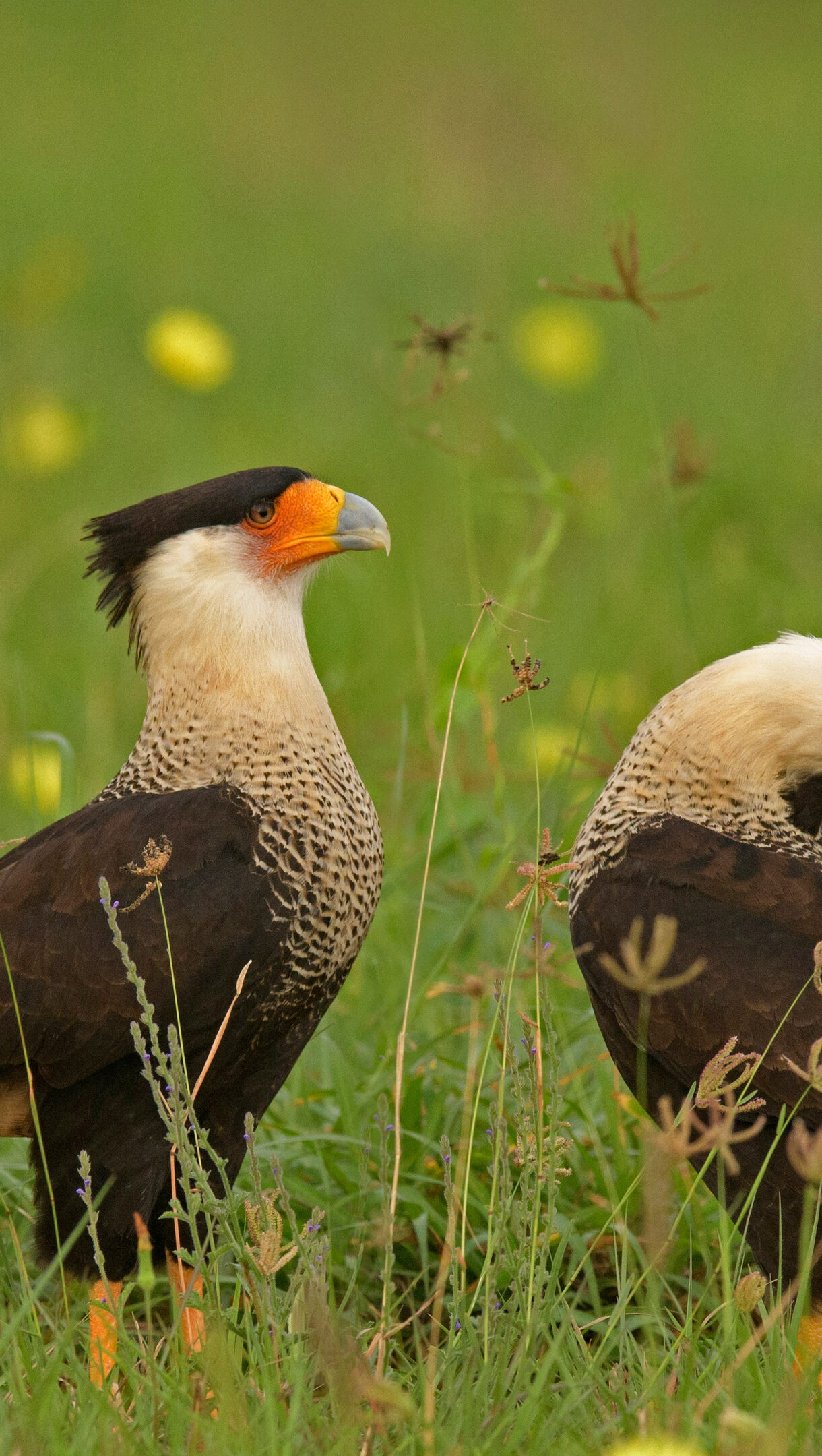 An enchanting 4K wallpaper captures two Crested Caracara birds actively courting in a vibrant green Texas field. Their distinctive black, white, and orange plumage stands out against the soft focus of scattered yellow wildflowers, creating a serene and intimate mood.
