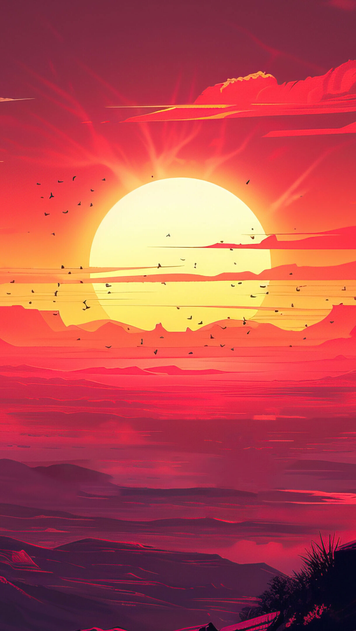 A stunning 4K wallpaper featuring a crimson sunset scenery with vibrant colors illuminating the evening sky. The breathtaking view captures the serene beauty of nature, making it an ideal choice for your desktop or mobile wallpaper.