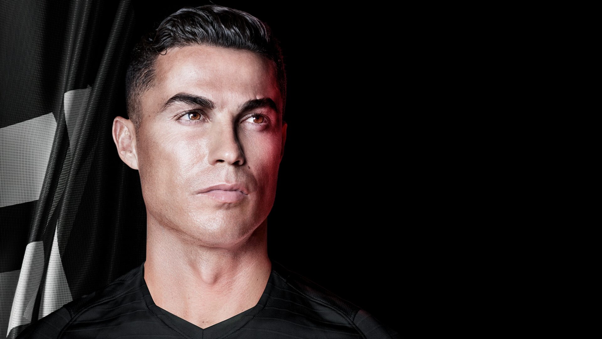 A striking 4K wallpaper featuring Cristiano Ronaldo against a sleek black background. The high-resolution image highlights his intense expression and athletic stature, perfect for creating a bold and dynamic desktop or mobile background.
