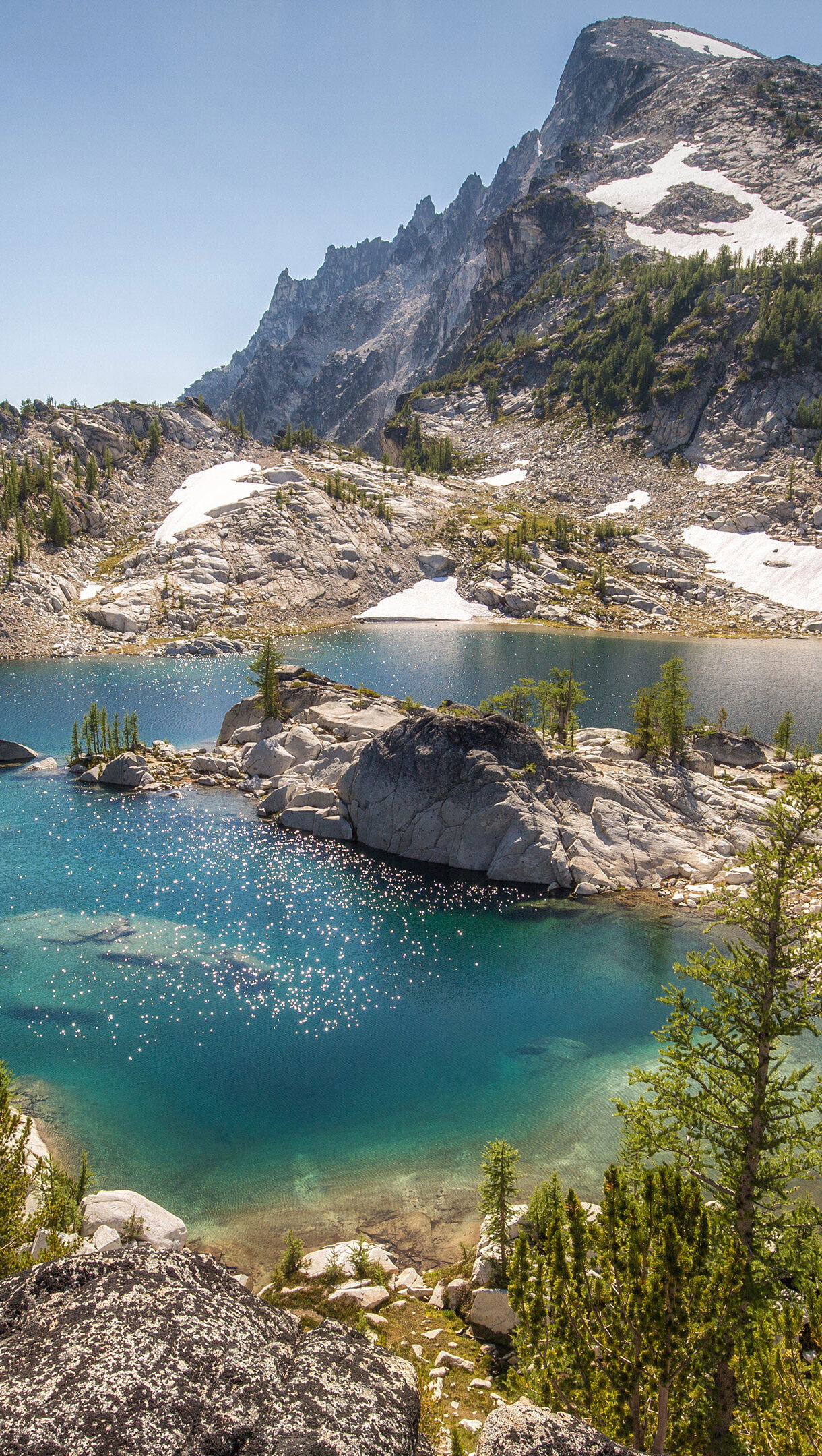 An enchanting 4K wallpaper portrays the pristine Crystal Lake nestled within the rugged Alpine Lakes Wilderness mountain landscape. Its crystal-clear turquoise waters glitter with sunlit sparkles, surrounded by majestic granite peaks dotted with snow patches and resilient evergreen trees under a clear blue sky.
