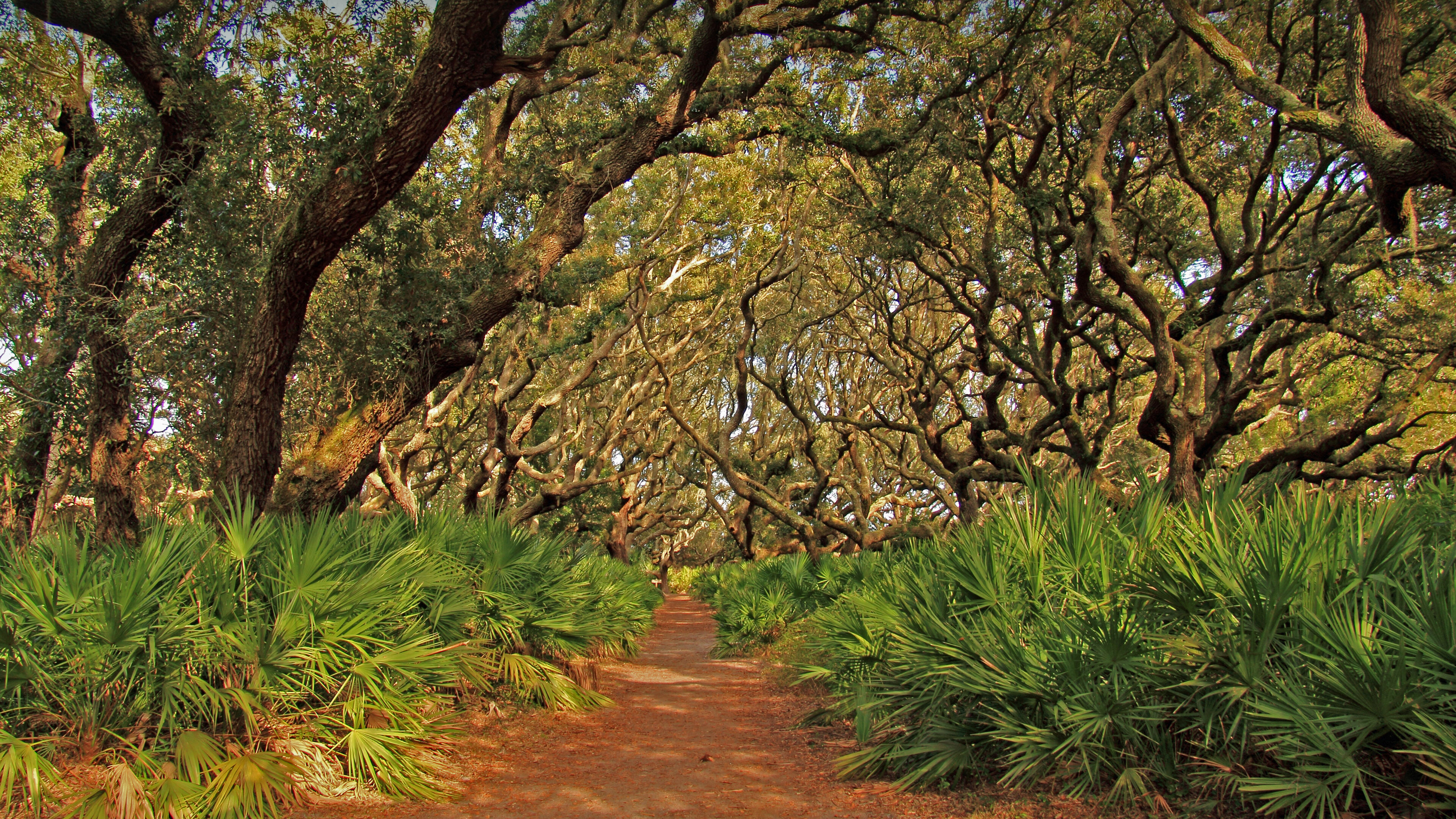 A captivating 4K wallpaper of a tranquil path winding through the ancient Live Oak forests of Cumberland Island National Seashore, Georgia. Dappled sunlight filters through the dense, sprawling canopy of gnarled Live Oak branches, illuminating the vibrant green undergrowth and the inviting sandy path.
